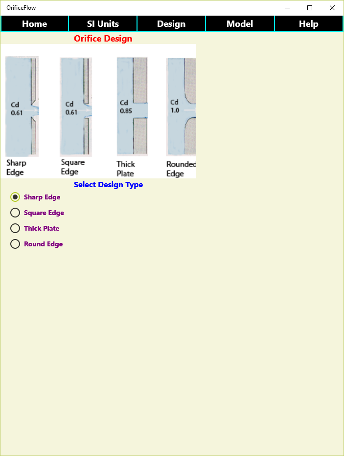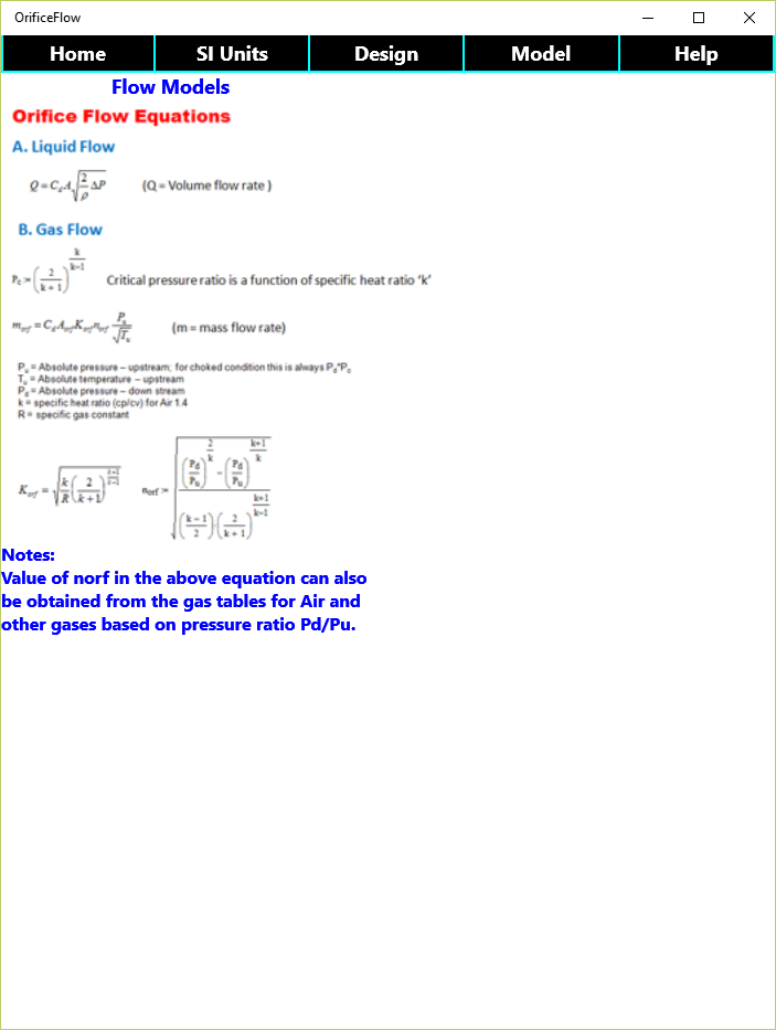 App gives four standard orifice design with recommended discharge coefficients as shown in the screen shot. It also gives the details of different parameters used in the computation of flow rates of liquid and gases. This model is valid even for nozzles, venturi-tubes and meters for which the default discharge coefficient (Cd) is unity.
