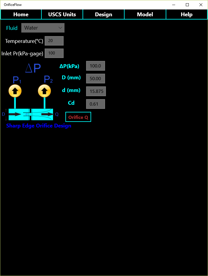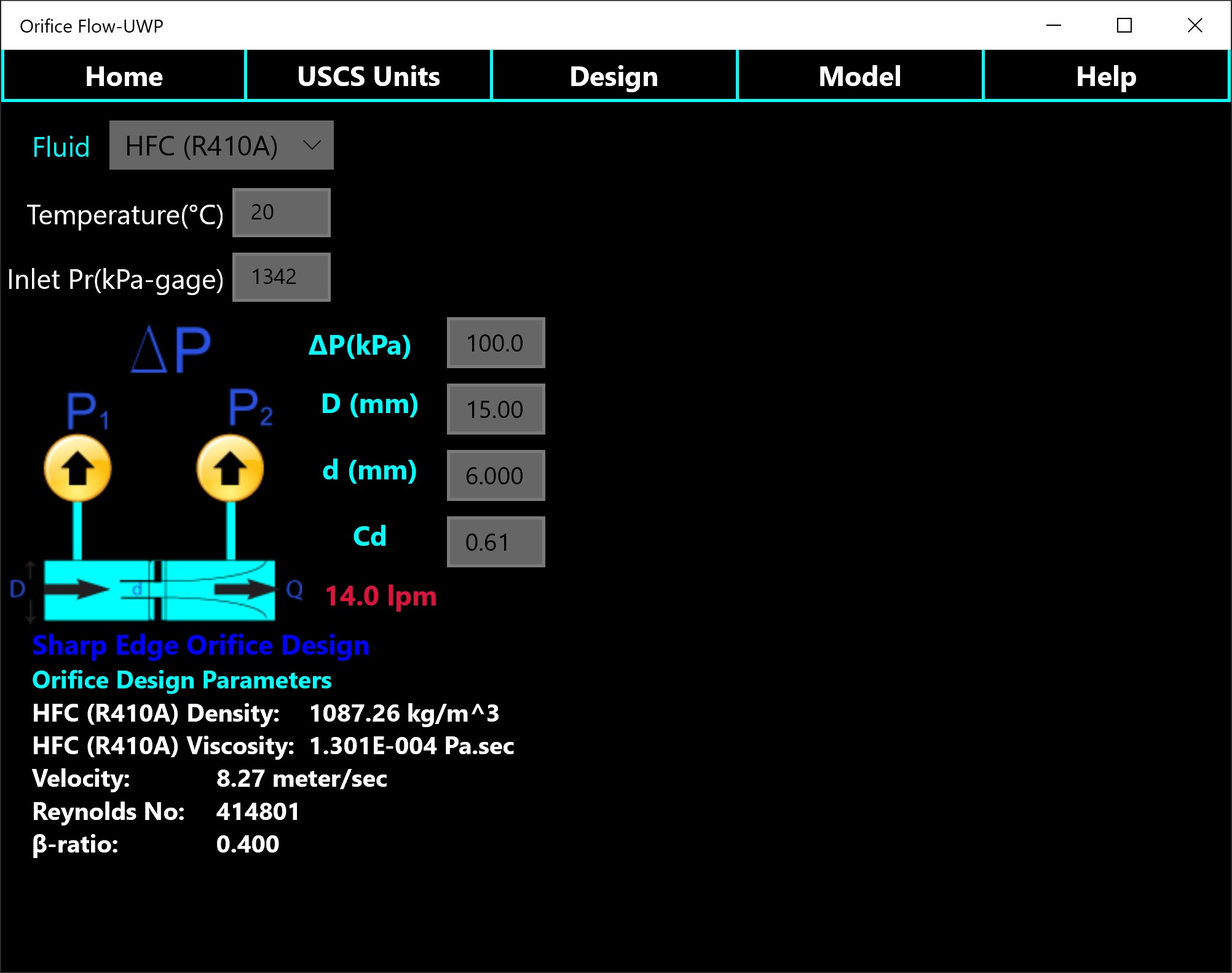 Orifice Flow-UWP app is for Windows 10 devices that facilitates measurement of fluid flow in pipes and conduits using orifice plates that are very common in industrial applications. This app quickly computes the flow rates for liquid and gases based on standard parameters as per the model shown. Users can pick any fluid from a list of fifteen most common fluids used in industrial applications. Therefore, this app can be a very helpful tool for practicing engineers and designers in measurement of flows in pipes and conduits.