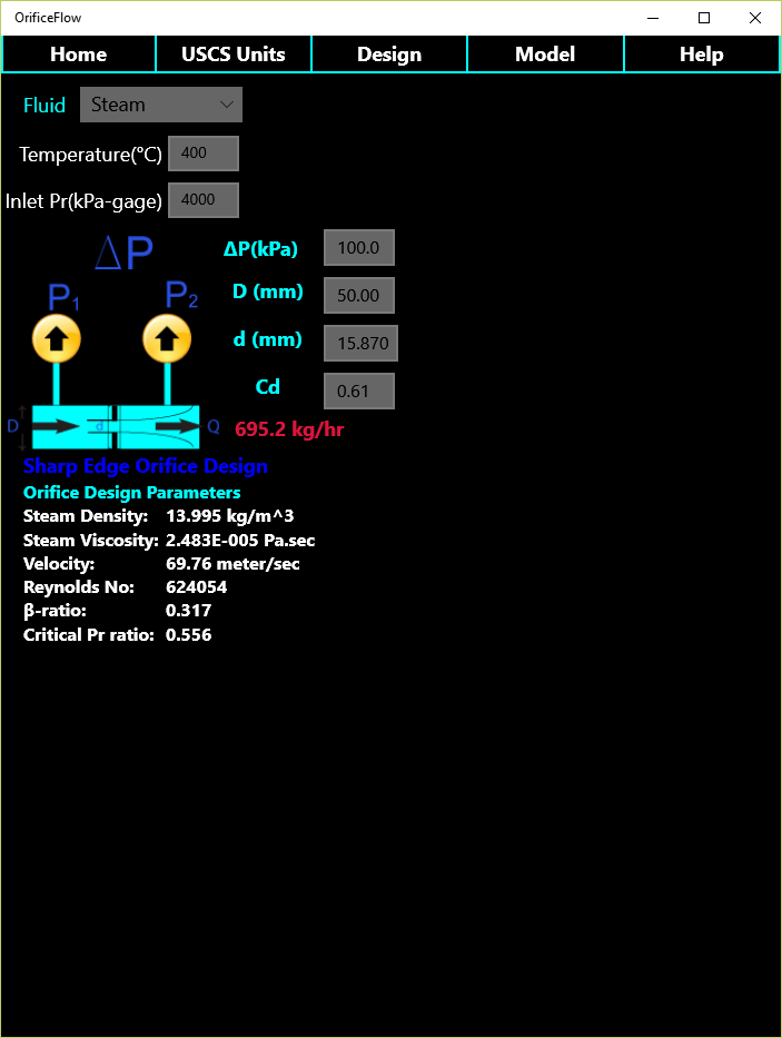 Fluid inlet temperature and pressure, orifice geometry, pressure differential using standard pressure taps (ISO 5167), are the standard parameters required in the computation. Based on the orifice geometry, recommended discharge coefficient Cd is used. However, users can edit this using manufacturer’s data for more accurate results.