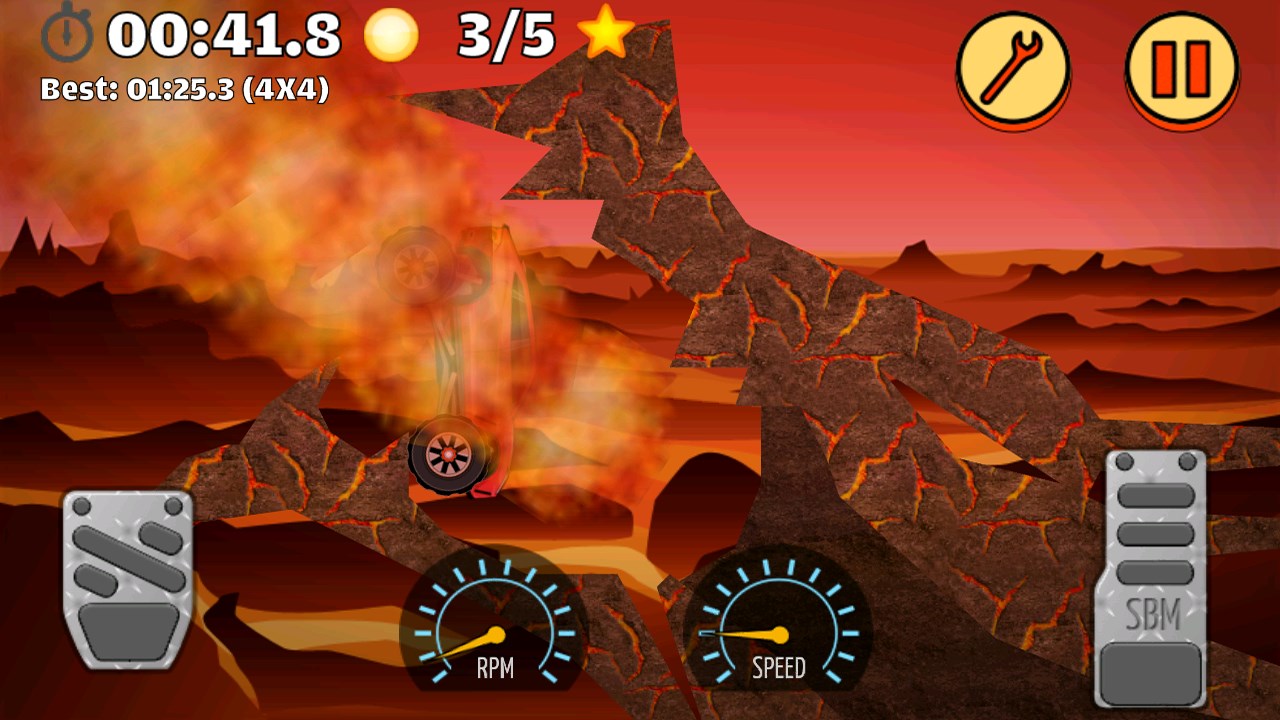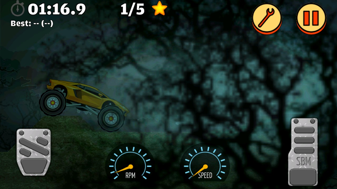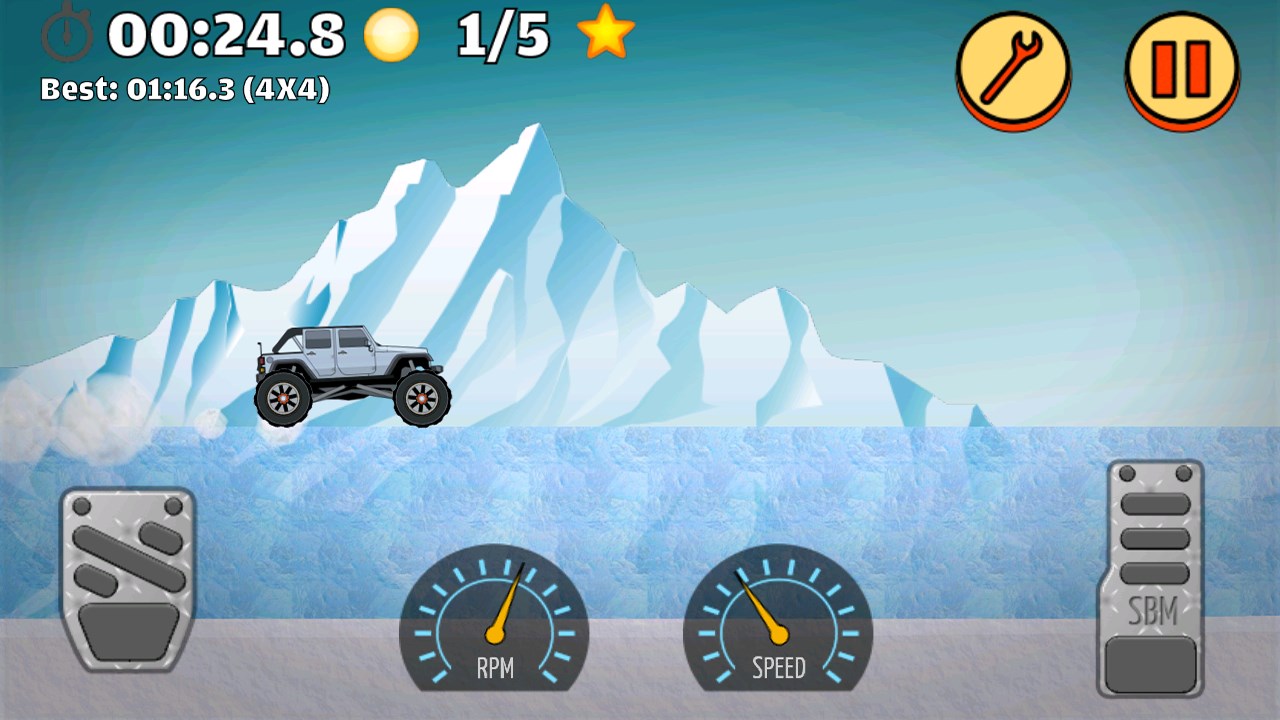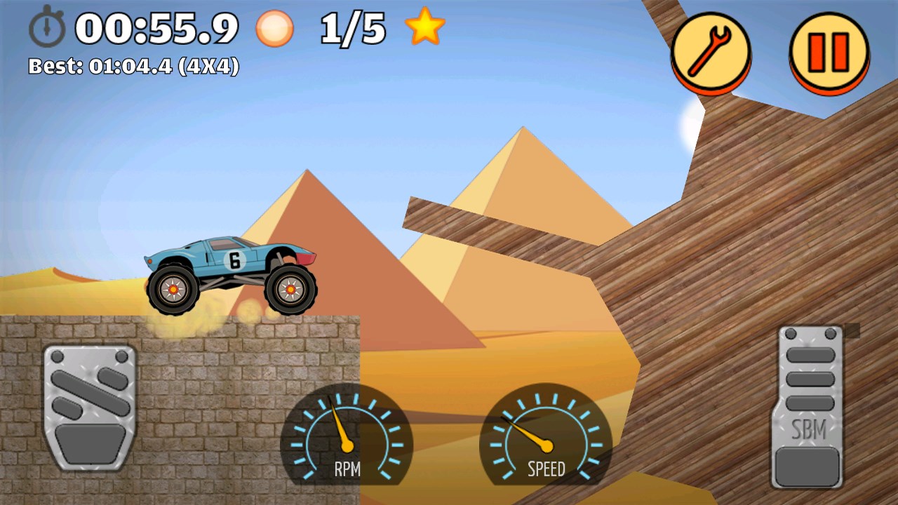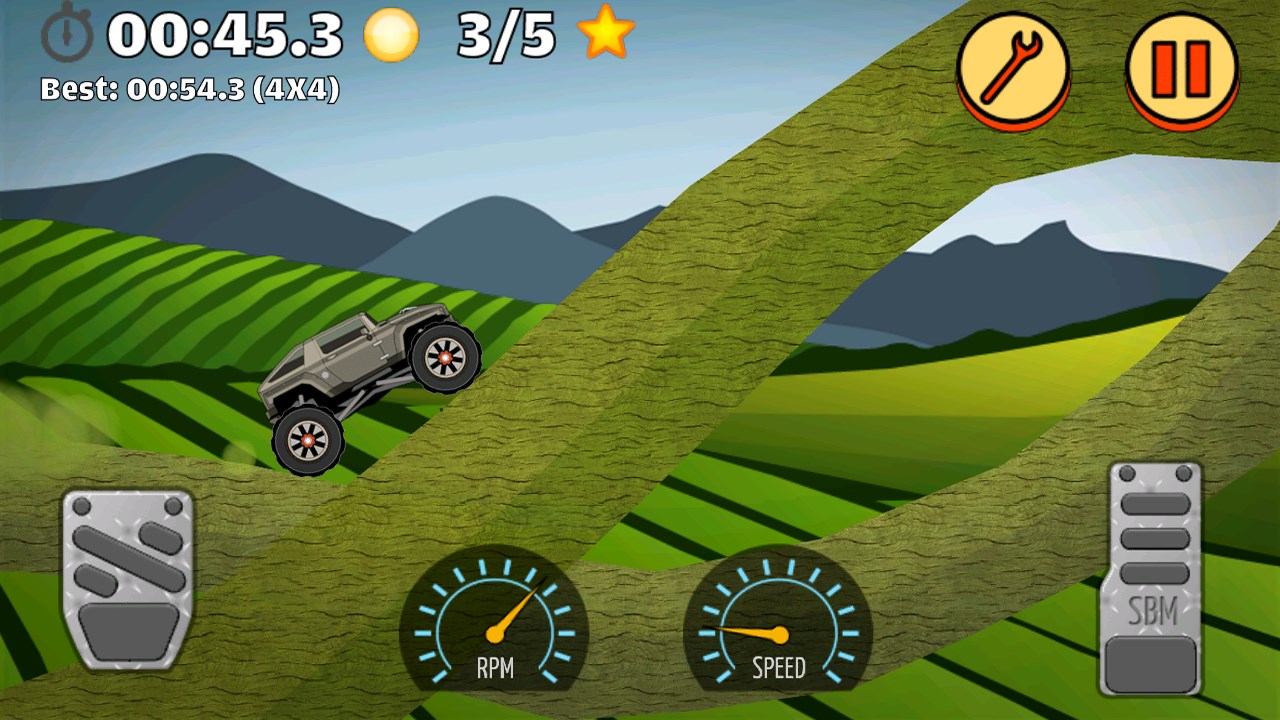 You can directly adjust wheel size, car height, suspension travel, and suspension stiffness. Set up your car depending on the terrain, obstacles, and your style of driving. Gain momentum before trying to climb a hill.