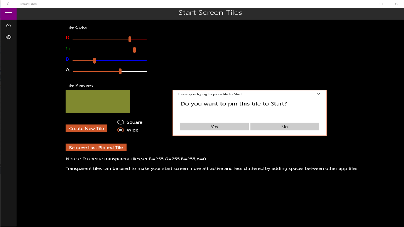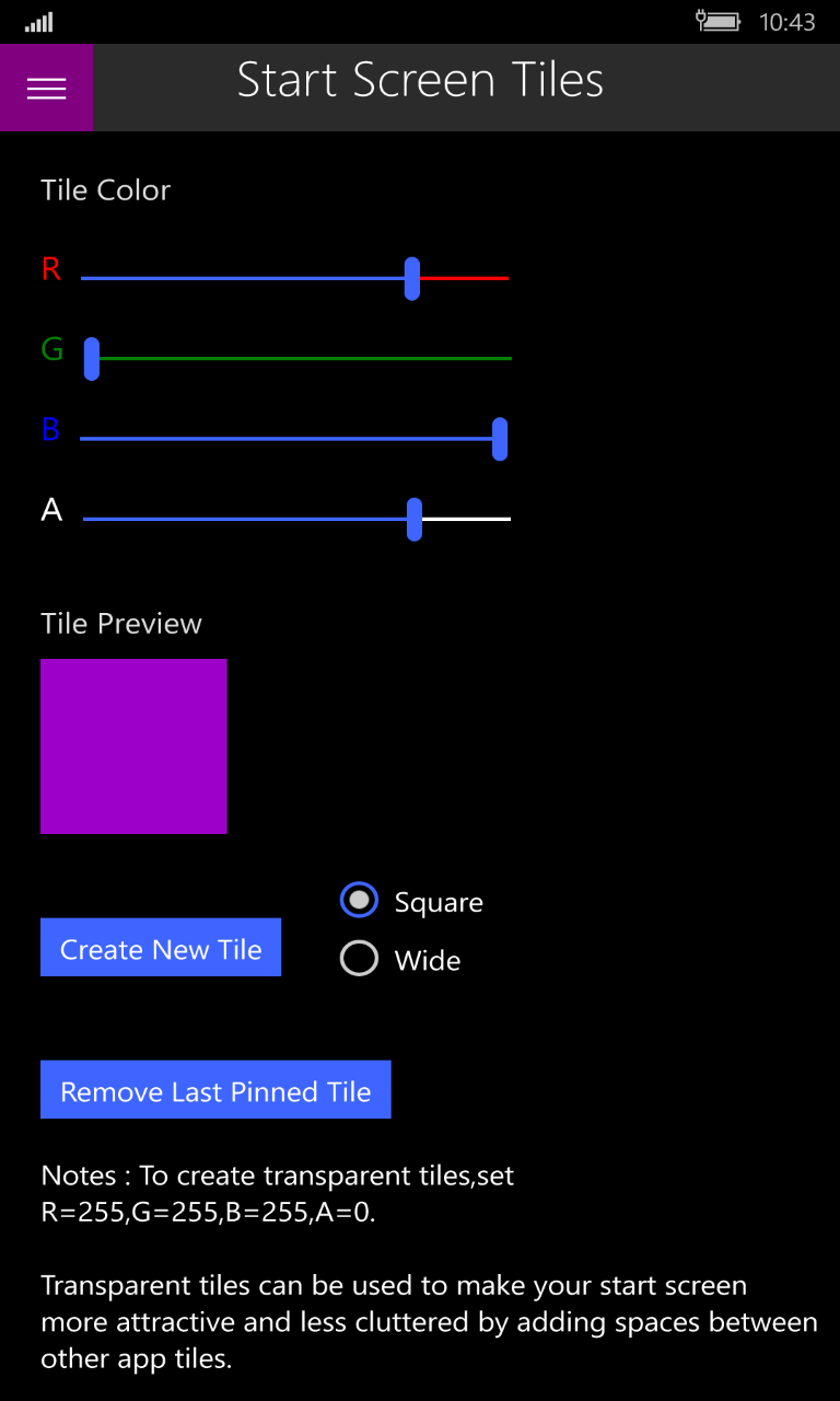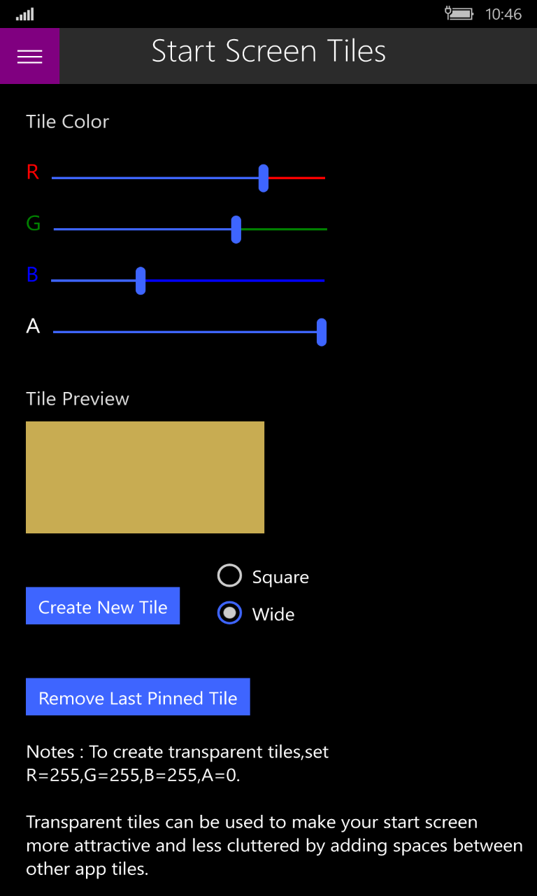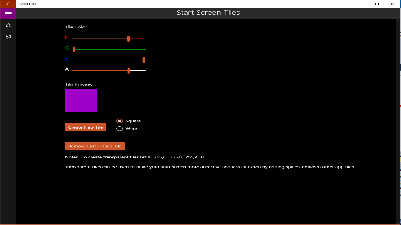 Allows you to customize your start screen by create transparent or coloured Tiles.Any number of tiles with desired colour could be created Use the tiles created by the app to create a personalized start screen