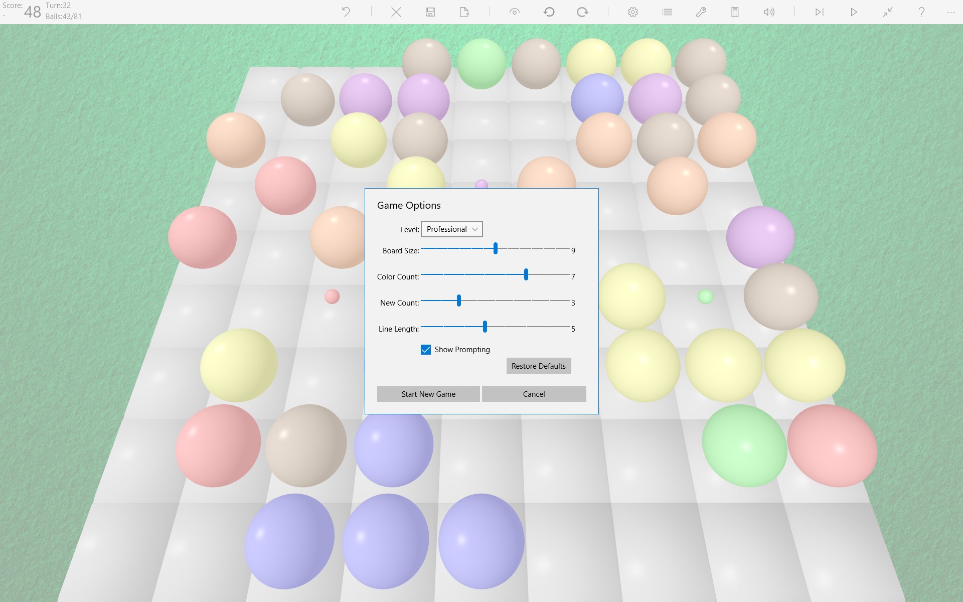By moving the balls on the board you form lines (horizontal, vertical and diagonal) of at least five balls of the same color. Once you formed a line, the balls in this line disappear and you earn some points. If you did not form a line, three new balls are added, and the game continues until the board is full. The goal of the game is to make optimal movements and earn maximum score.