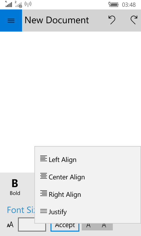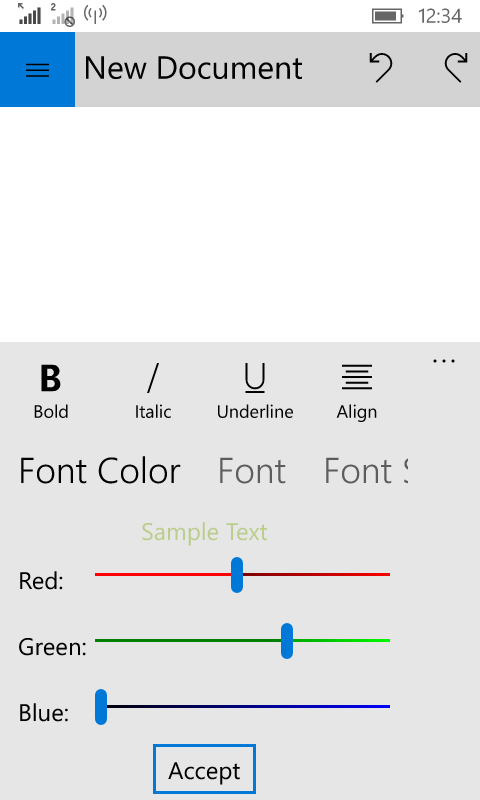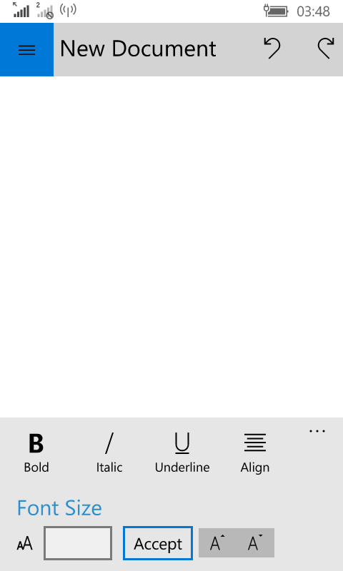 Supports RTF and TXT filesApply text formatting (Bold, Italic, Underline)Change font sizeIncrease or Decrease font size with one tapSupports Undo and Redo