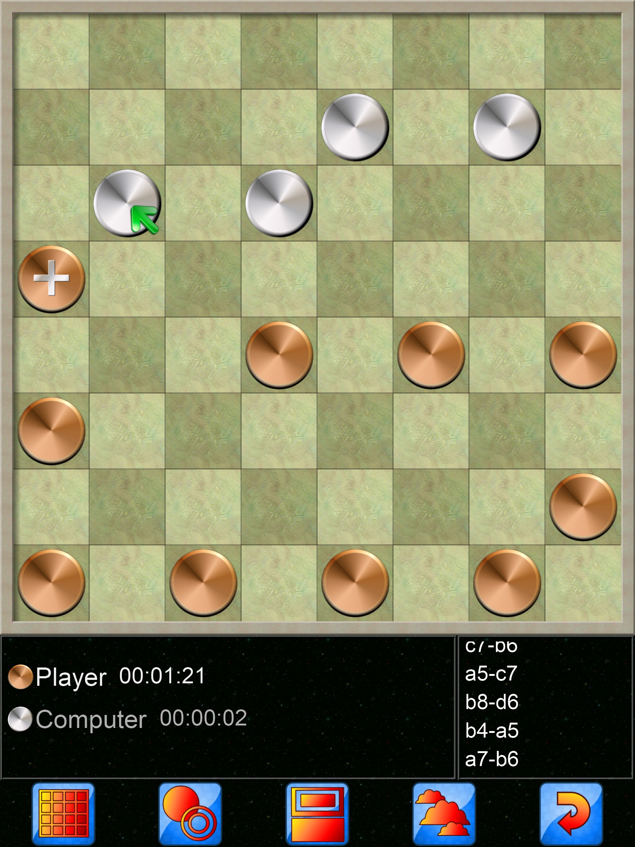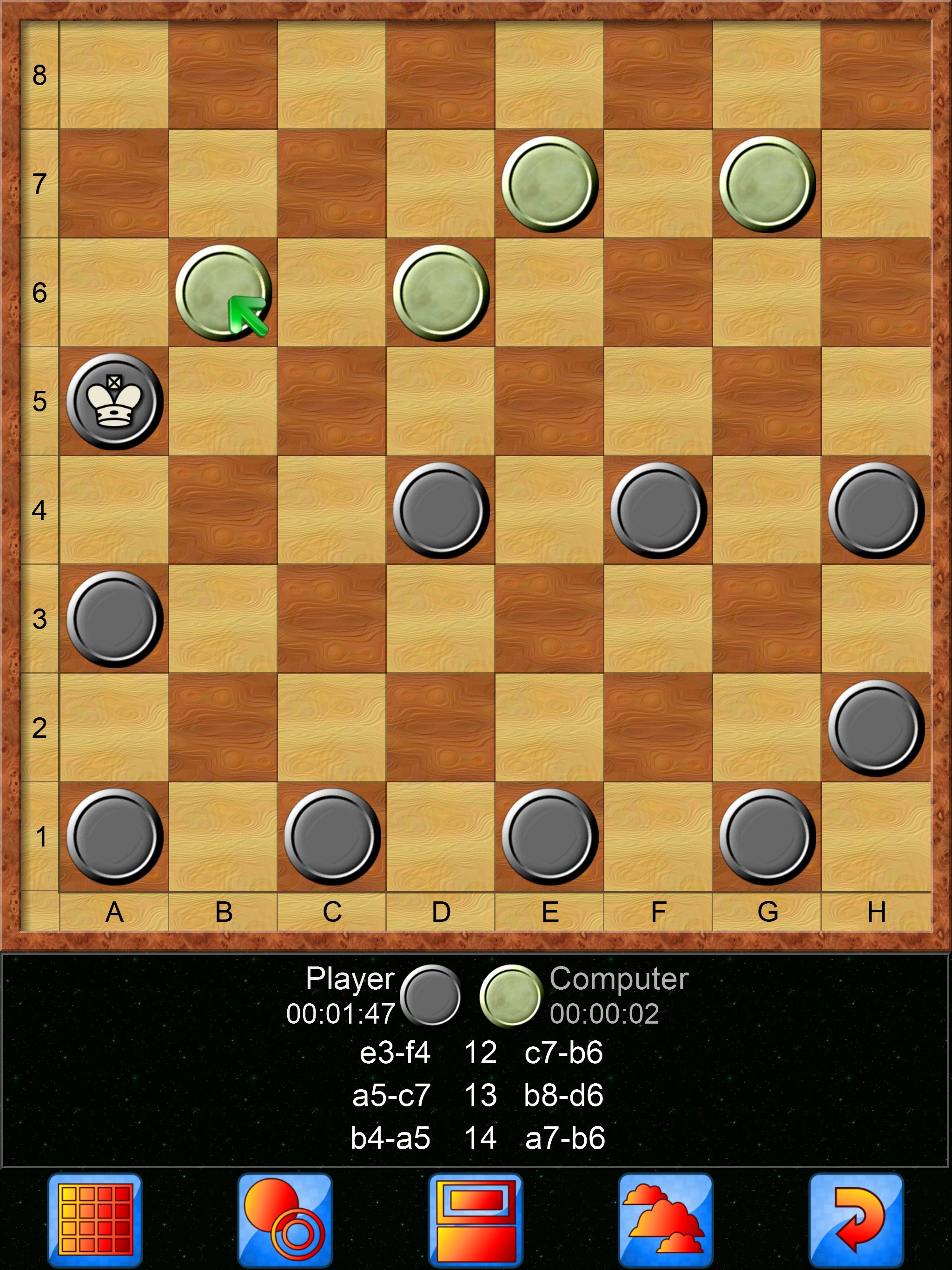 Support for over 10 different game variations including American, International, Italian and Russian Checkers.Play against the computer or another human player on the same device.Multiple time based levels, play moves or games against the clock.High quality artificial intelligence engine particularly at stronger levels.Support for alternate boards and pieces.Full undo and redo of moves.
