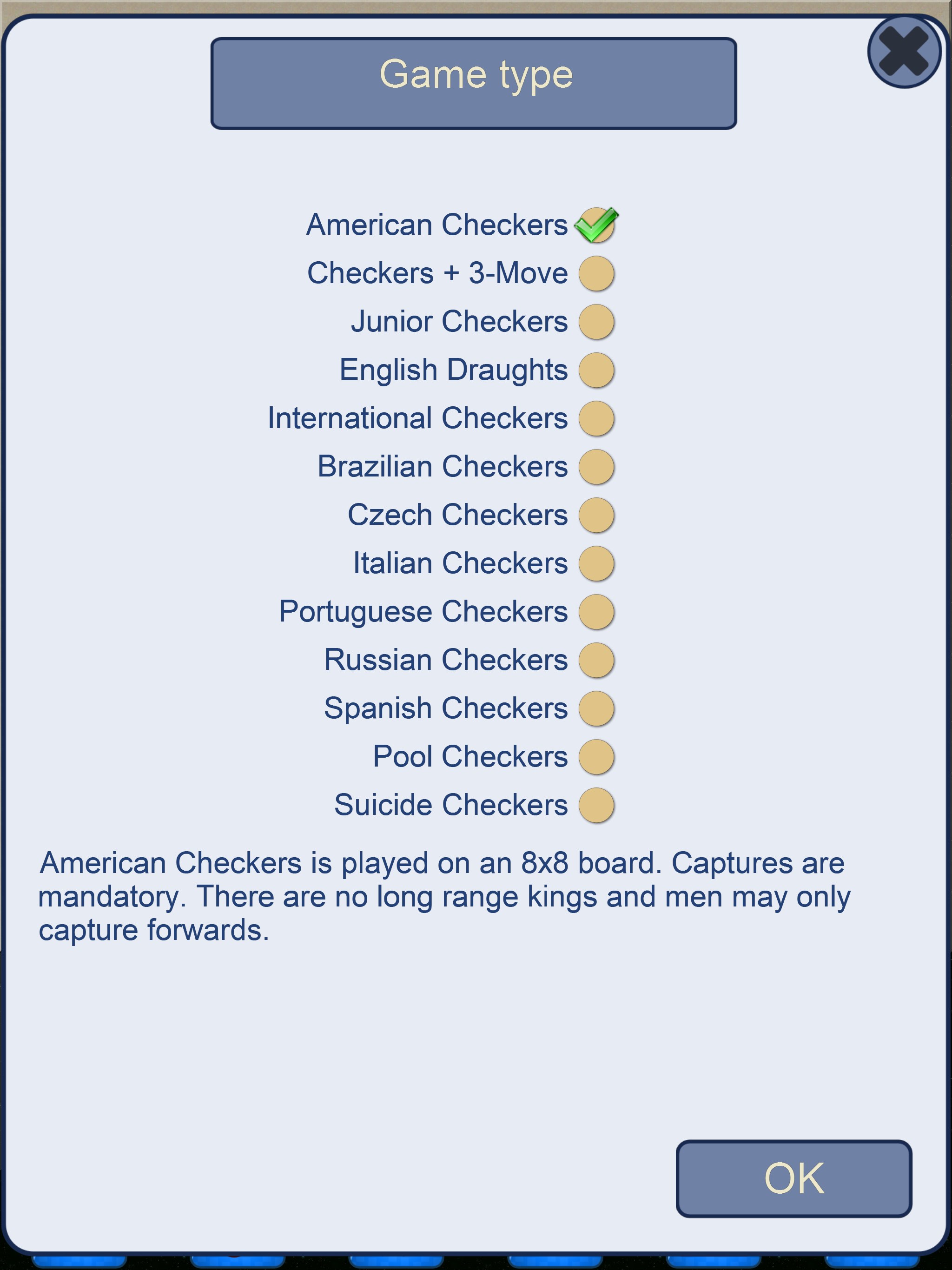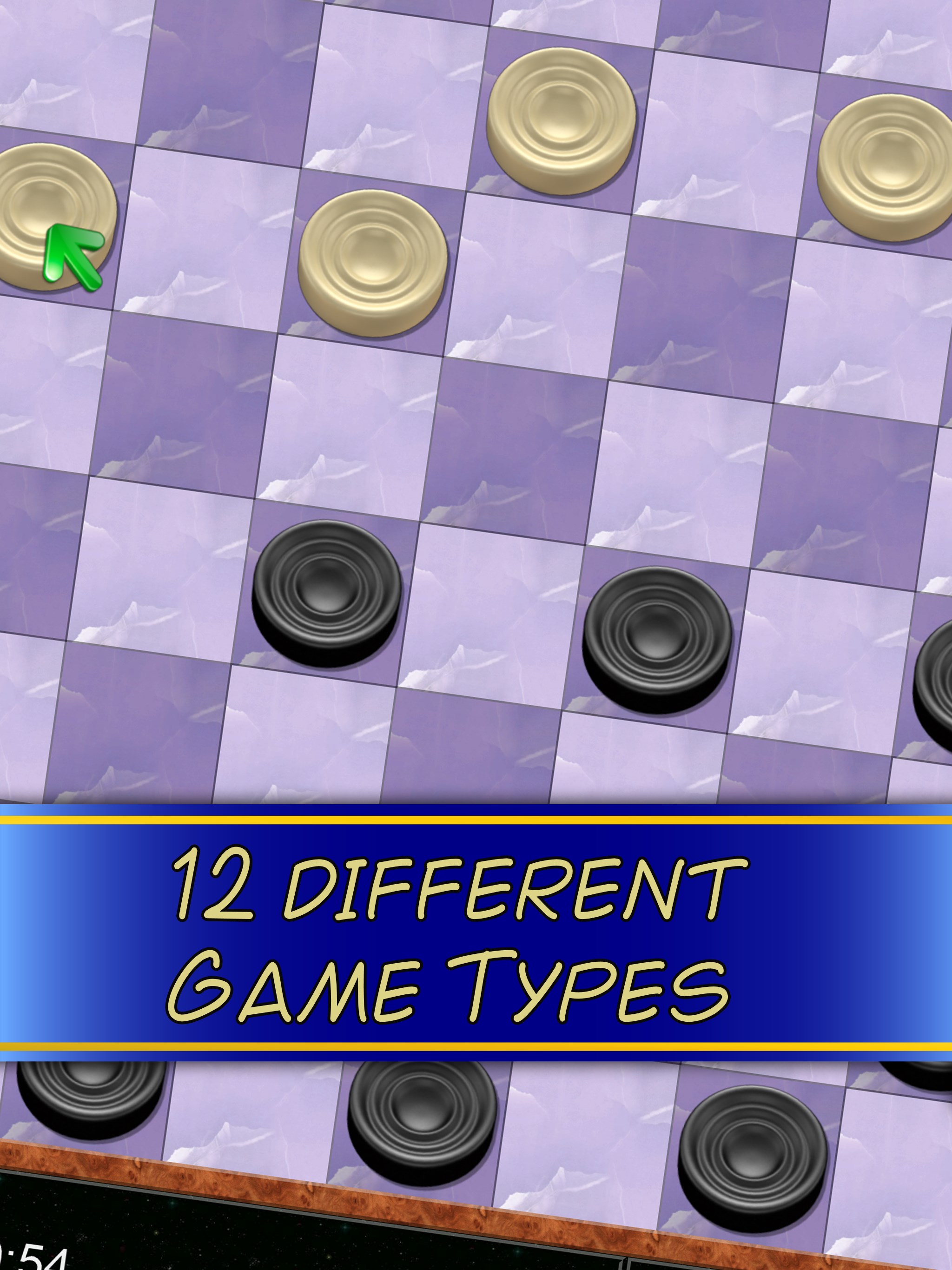 * Support for over 10 different game variations including American, International, Italian and Russian Checkers.