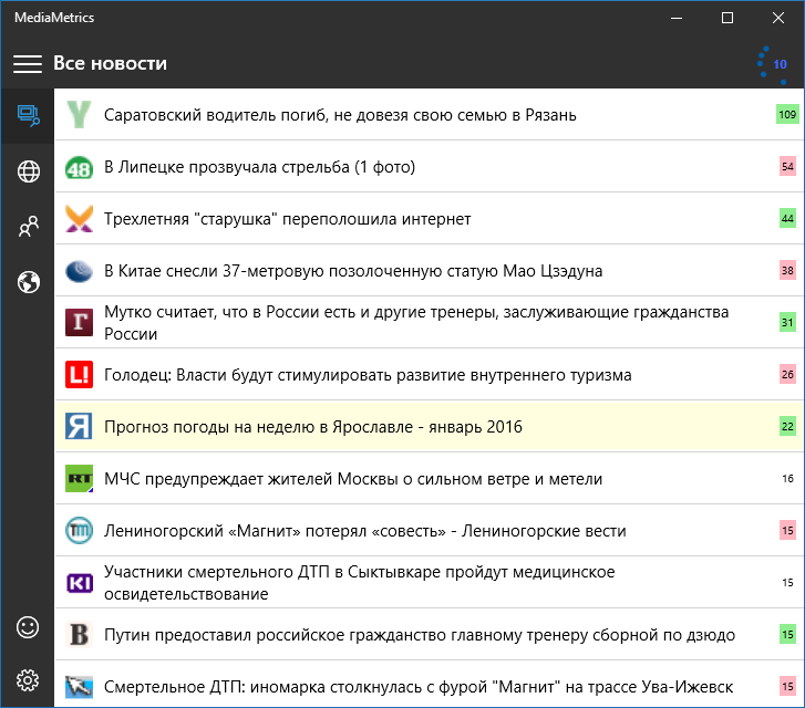 Приложение предлагает возможность просмотра списков новостей по ресурсам средств массовой информации и отслеживания рейтинга самых популярных и обсуждаемых событий.