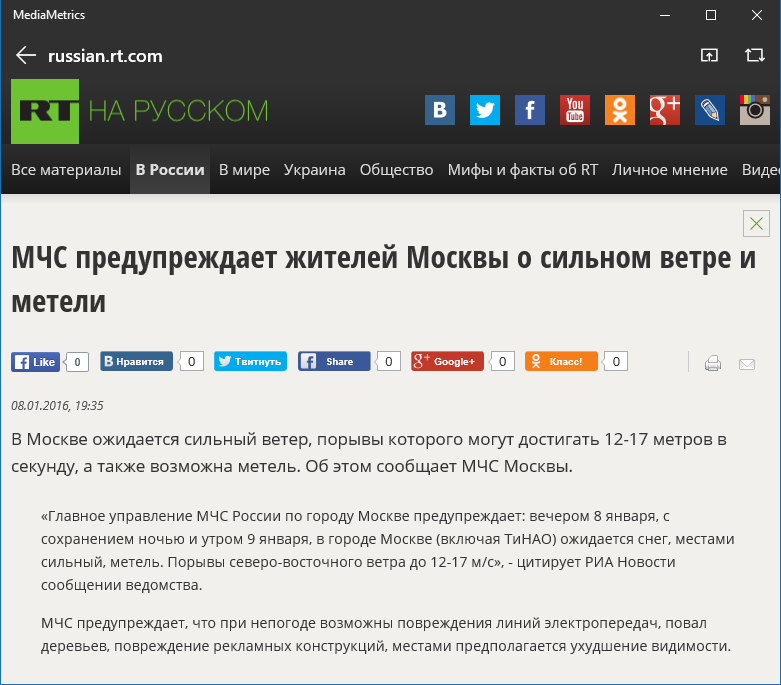 Заинтересовавшая новость может быть открыта для просмотра как в самом приложении, так и с помощью браузера, ссылка может быть отправлена сообщением или почтой друзьям, расшарена в Facebook или Twitter.