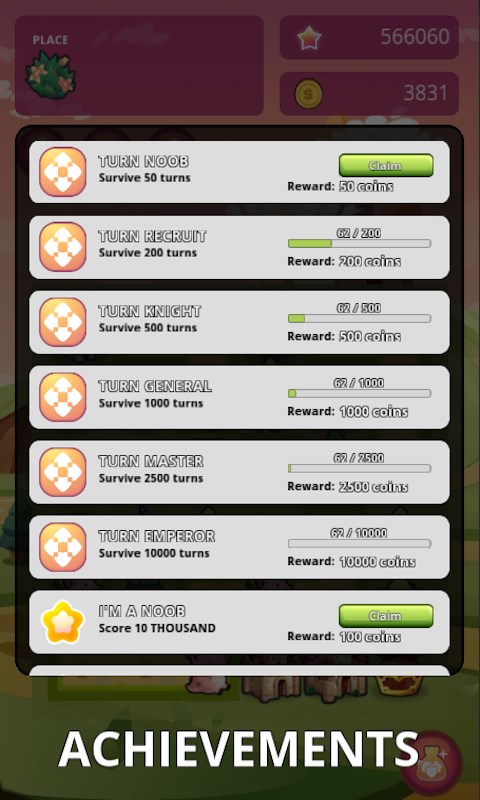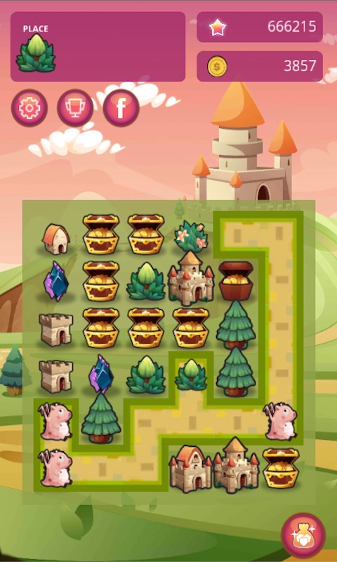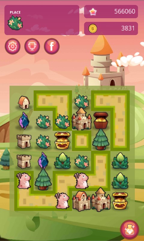 Place 3 or more of the same object side by side to upgrade them. Grow from grass, to trees, to houses, and all to way to castles.