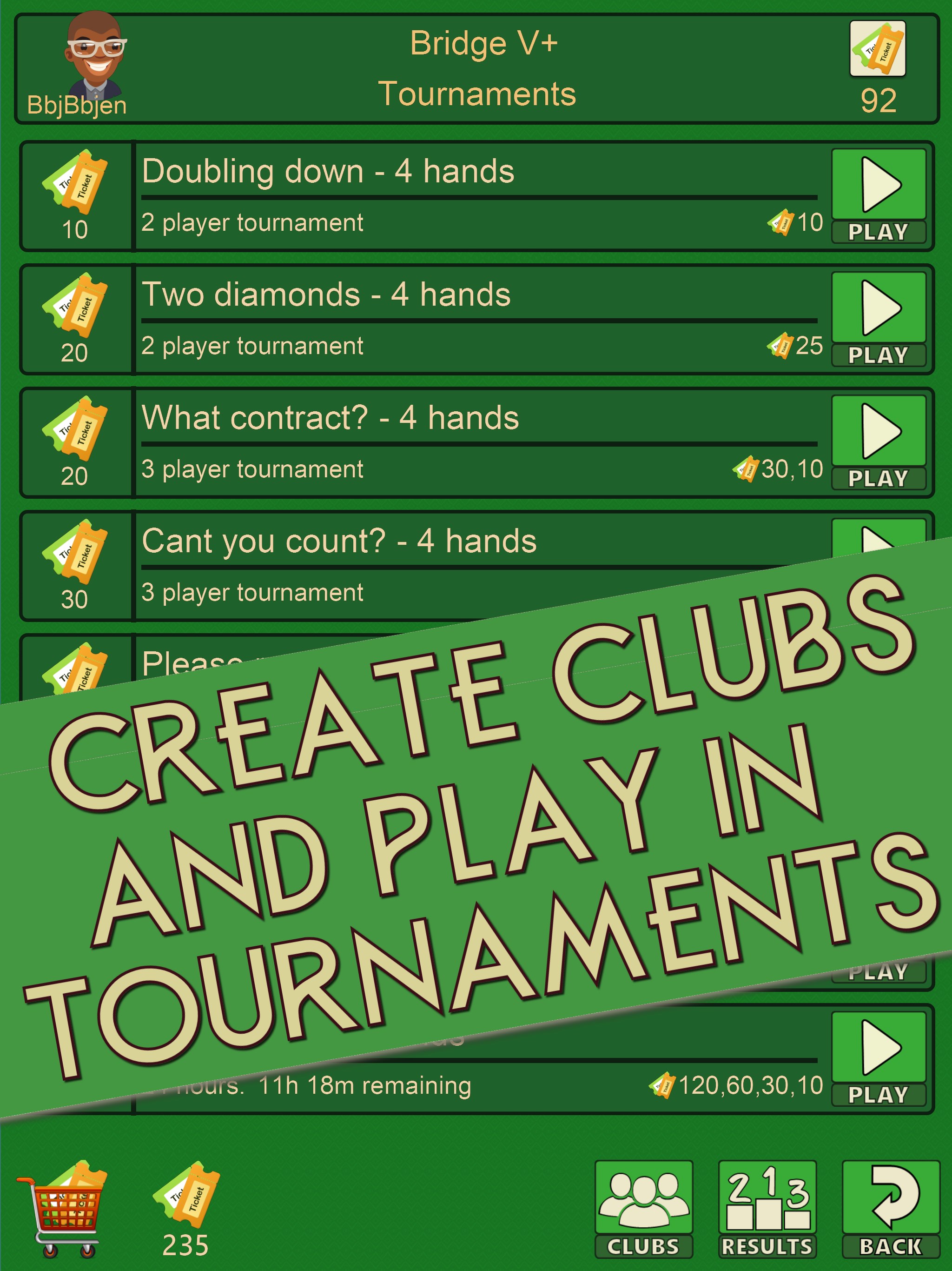 Please NOTE: Bridge tournaments cost money to host and run. You can purchase Ticketz to enter the Bridge tournaments using the In App Purchases available.
