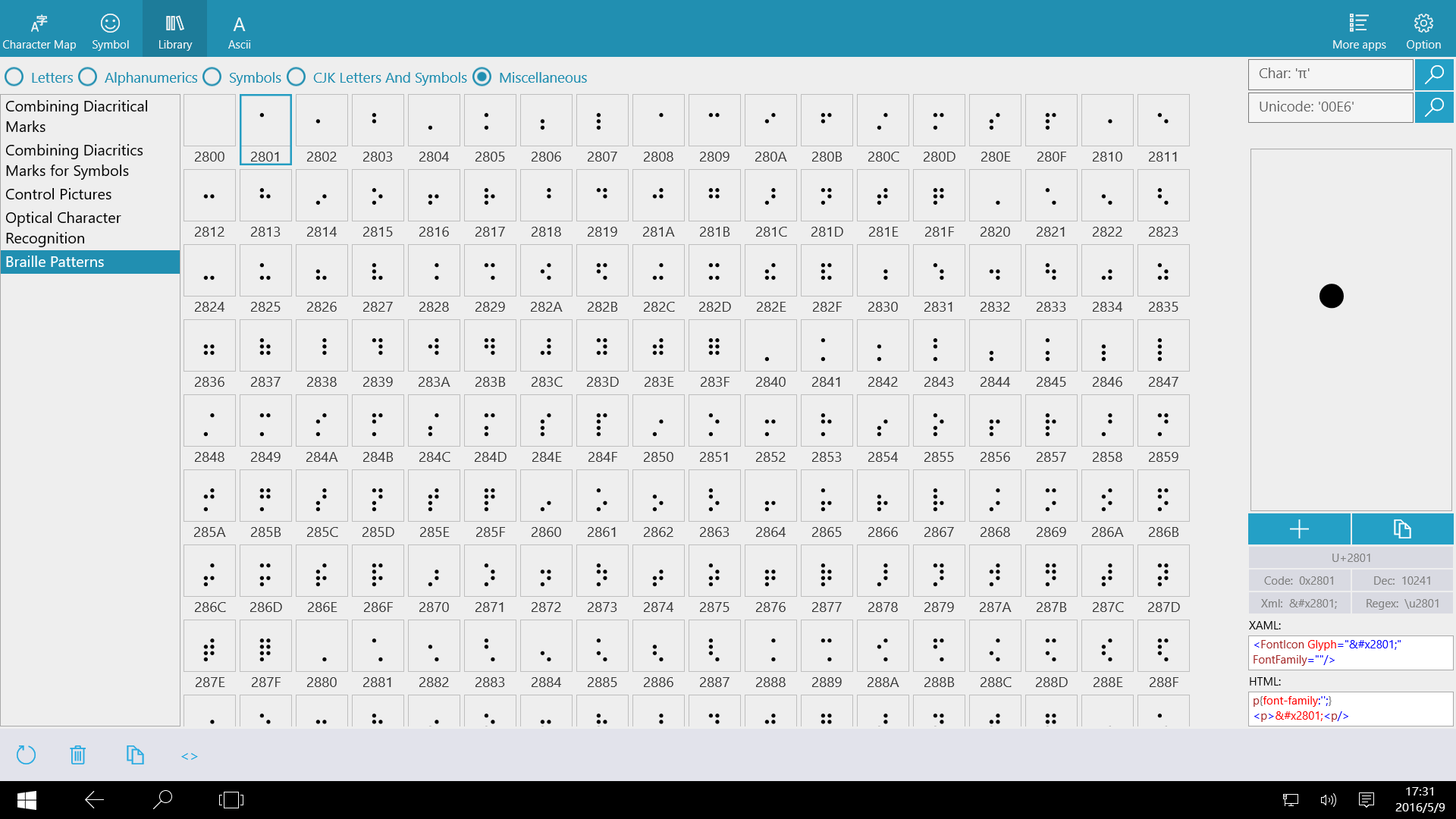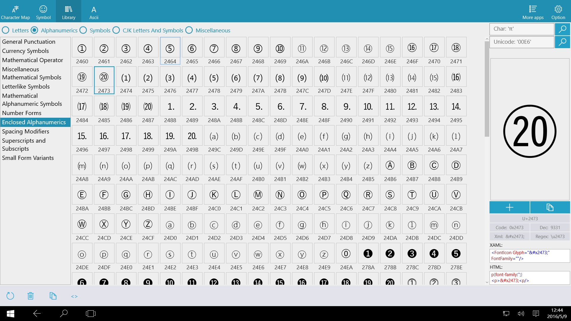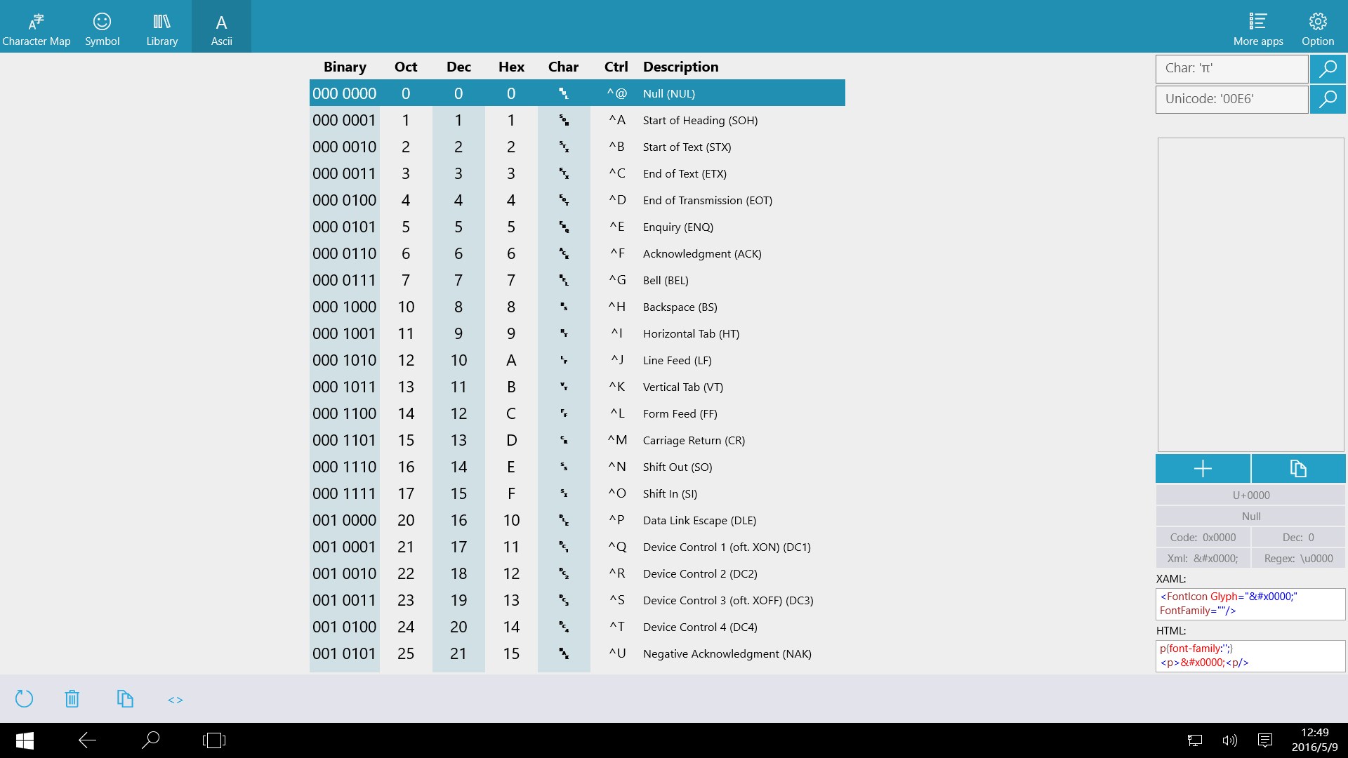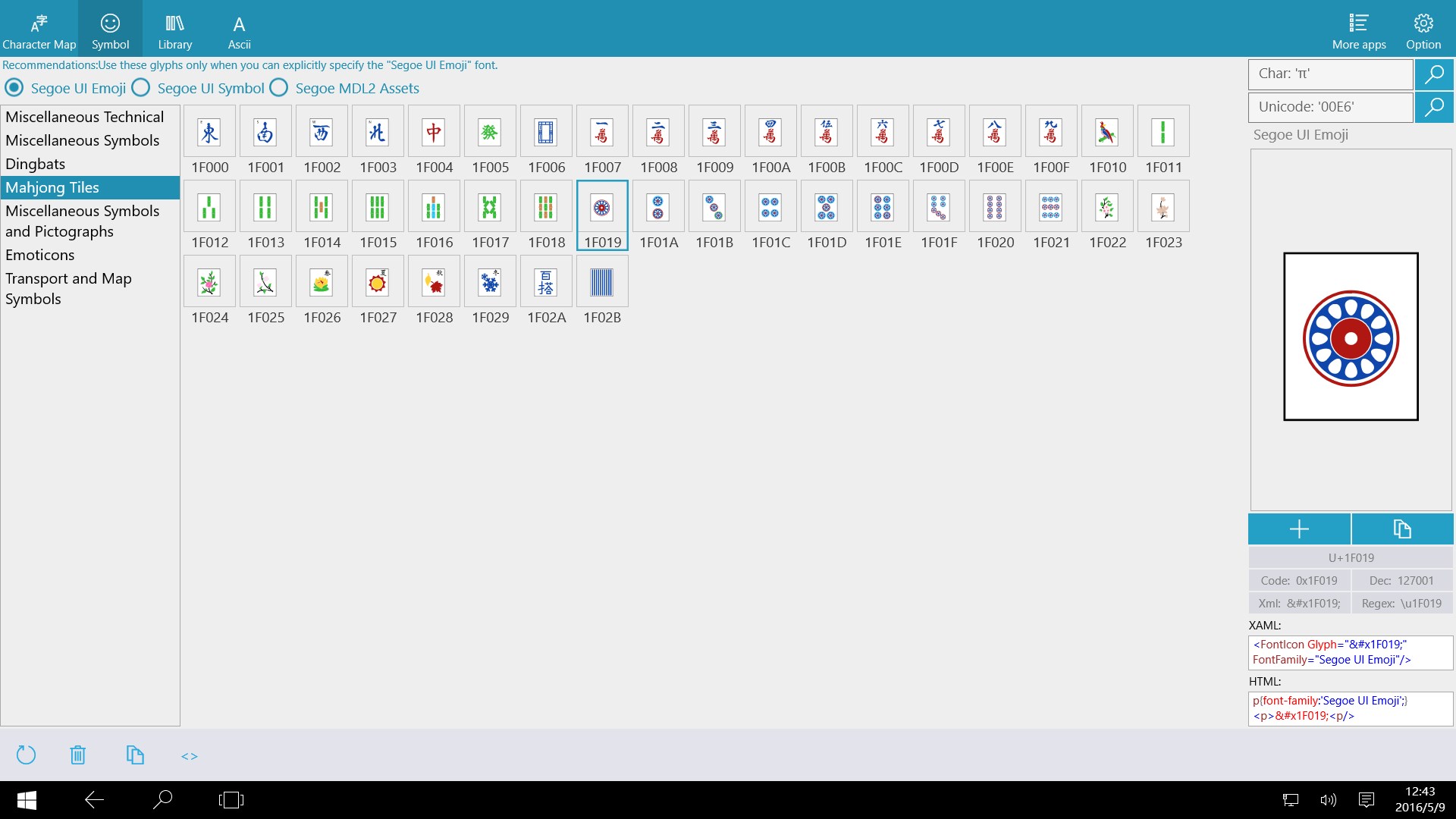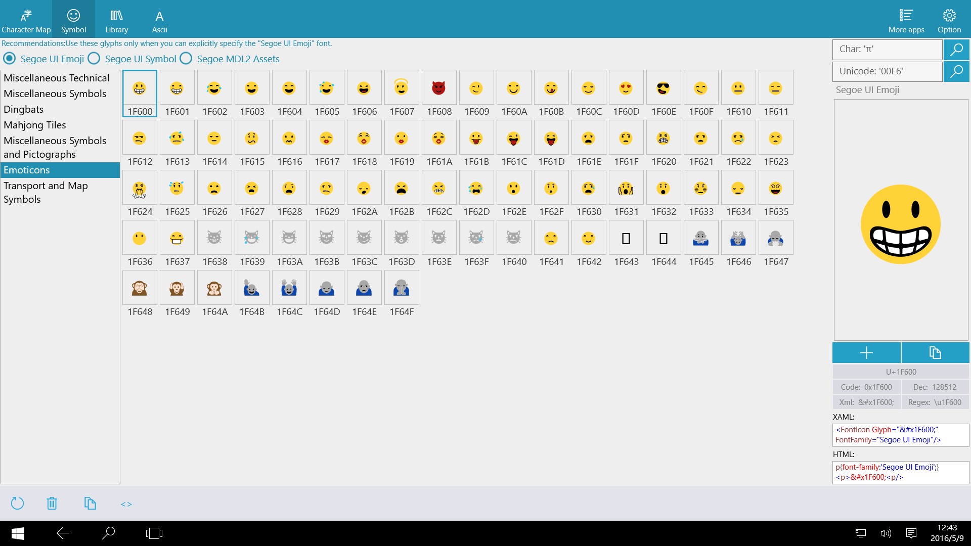 Character Map,Unicode Charts,Emoji,Symbol,Ascii in one app. you can copy character or code to the clipboard. Best tools for UWP application development.