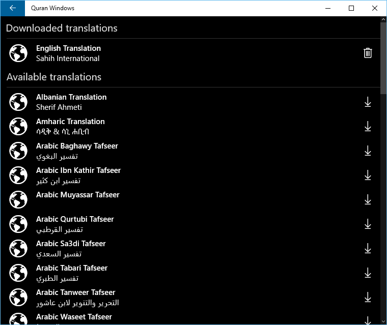 - translations in many different languages (currently, Arabic Tafseer, English Sahih International Translation, French, German, Indonesian, Malay, Spanish, Turkish, Transliteration, Bosnian, Russian, Bengali, Kurdish, Somali, Dutch, Swahili, Malayalam, Azerbaijani, Tamil, and Urdu) with more coming soon.