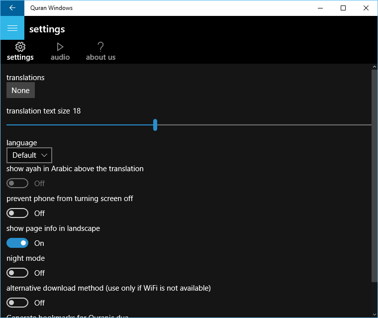 Quran Windows is a free, open source Quran application for Windows based on Quran Android project (http://android.quran.com/). It is also a successor to "Quran Phone" app for Windows Phone 7/8. There are many features still under development. Please send me your feedback and feature requests and keep all the contributors to this project in your prayers!