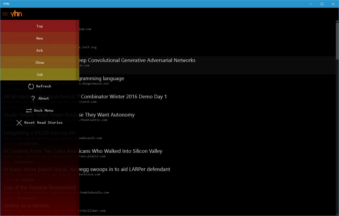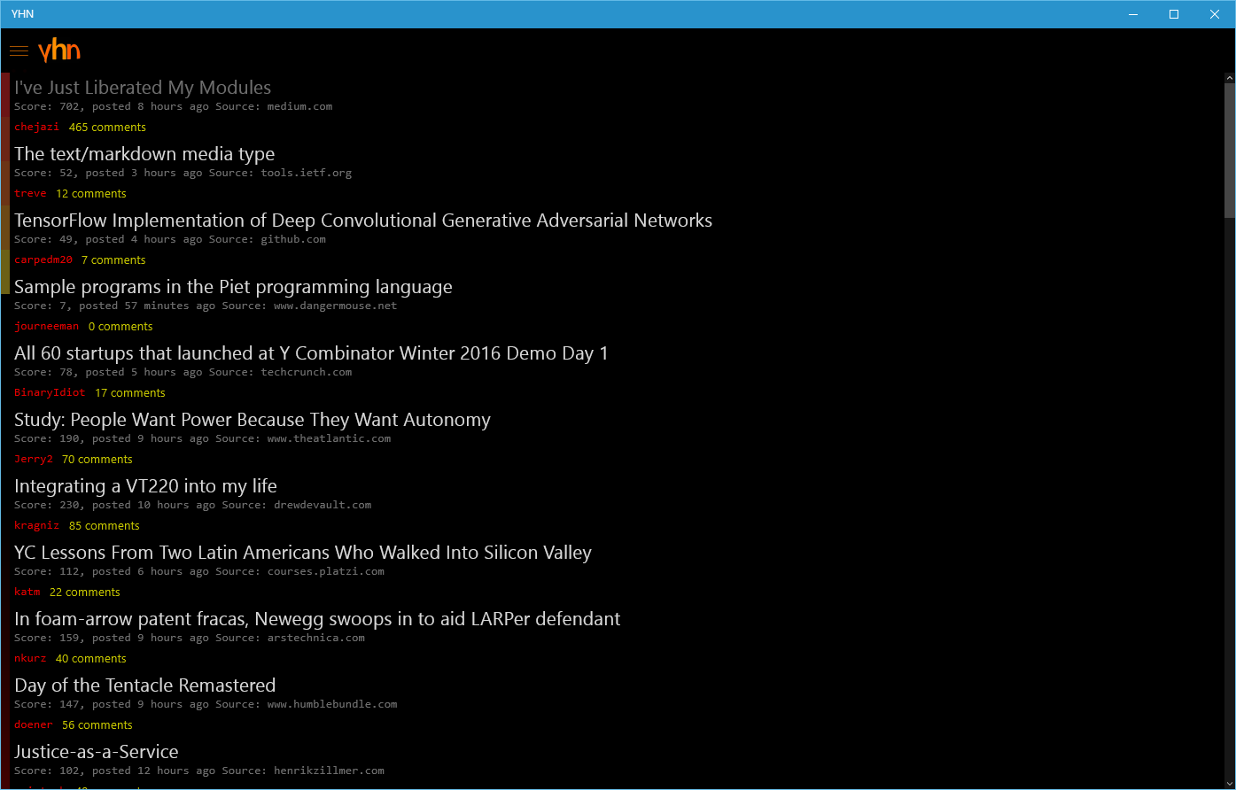 A simple and fast Hacker News client for the universal platform. This app is based on the firebase Hacker News API v0, which provides a list of stories and comments. The app incorporates a WebView for viewing articles, and a page that shows comments on a story.