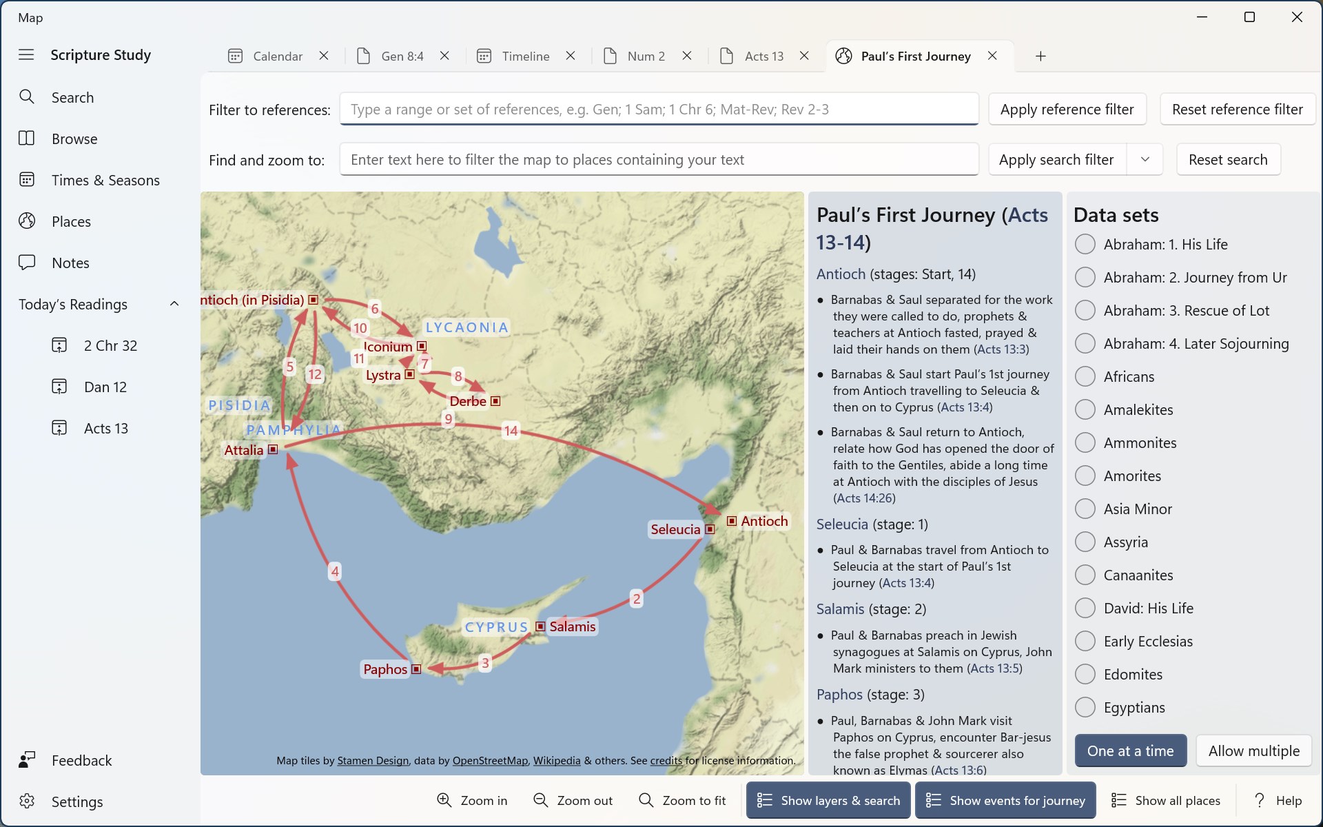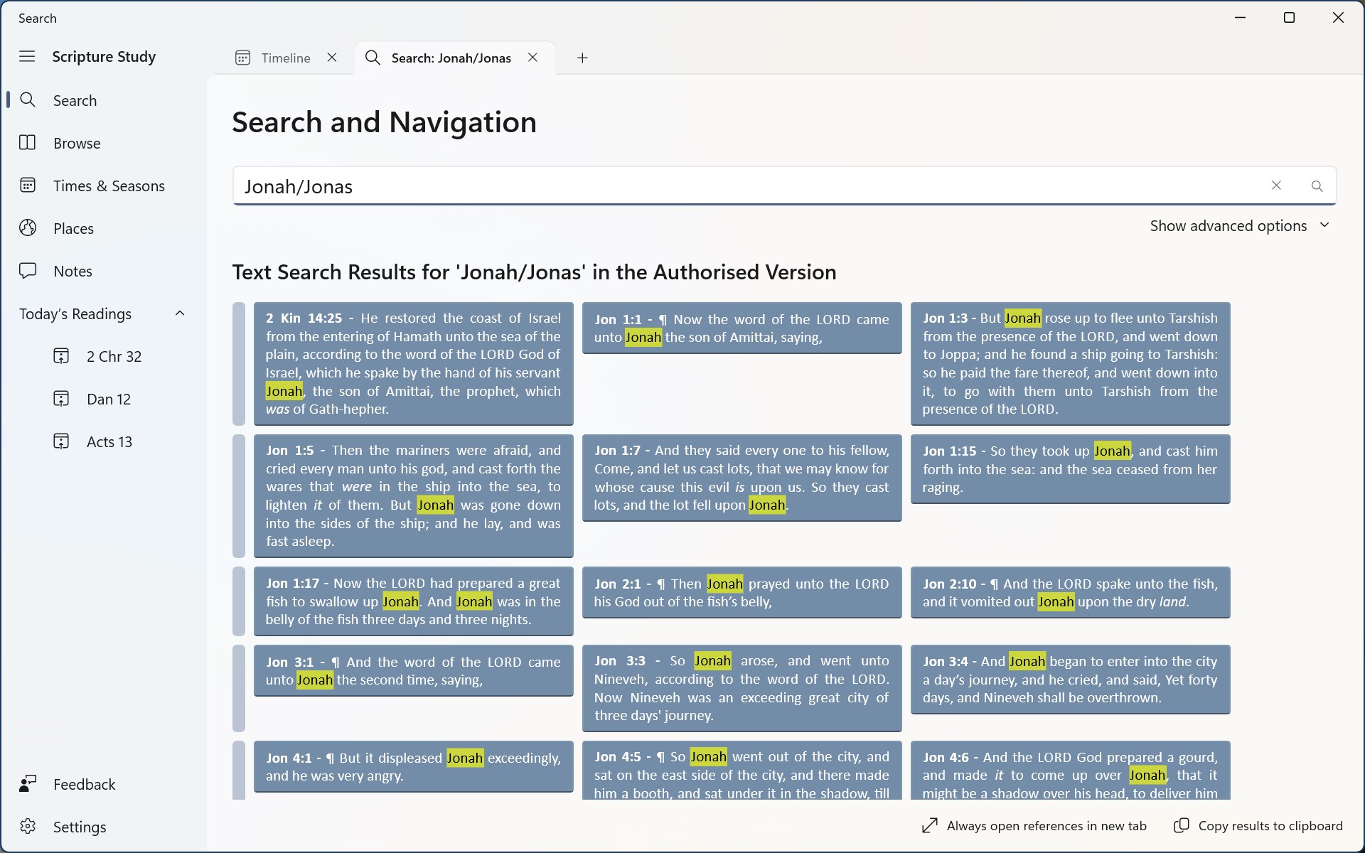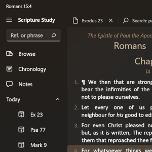 • The Authorised King James Version of the Bible • Free 30-day trial, then a very low one-off price for lifetime use & all updates • Add your own notes and store locally on your device or sync with OneDrive or DropBox • Bookmarks synced across devices with OneDrive or DropBox • Optional Strong\'s numbering, definitions and searches • Light and dark themes supported • Free from distractions and adornments • Study a Bible calendar, timeline and interactive maps • Compare to other versions: Young\'s Literal, Rotherham\'s Emphasized, Revised Version, American Standard, Basic English • Hebrew and Greek included: Septuagint, Masoretic Text, Scrivener\'s, Stephanus, Westcott and Hort • Includes Treasury of Scriptural Knowledge notes and references, Vine\'s, Hitchock\'s, Smith\'s & Fausset\'s Dictionaries and Nave\'s Topical Bible • Designed for Microsoft Surface and Windows 11 (supports all of: touch, pen, mouse and keyboard) • Works offline (maps only near any places mentioned in the Bible), useful in places without a good internet connection or mobile signal • Daily reading suggestions