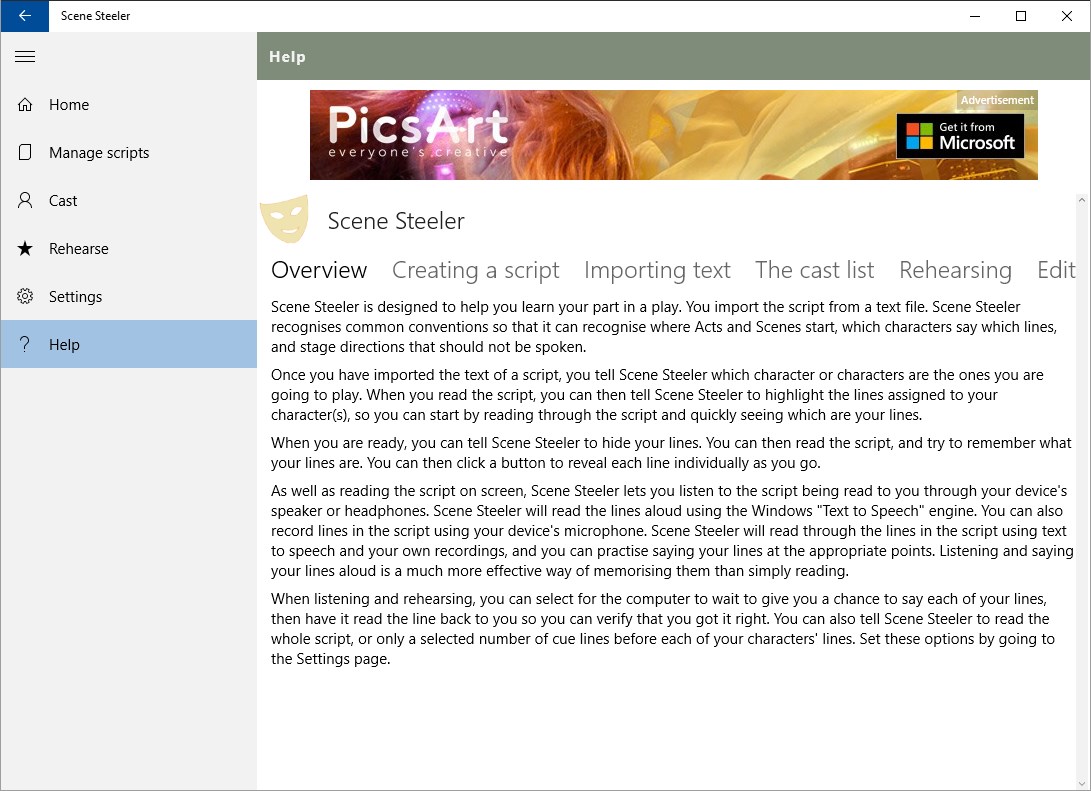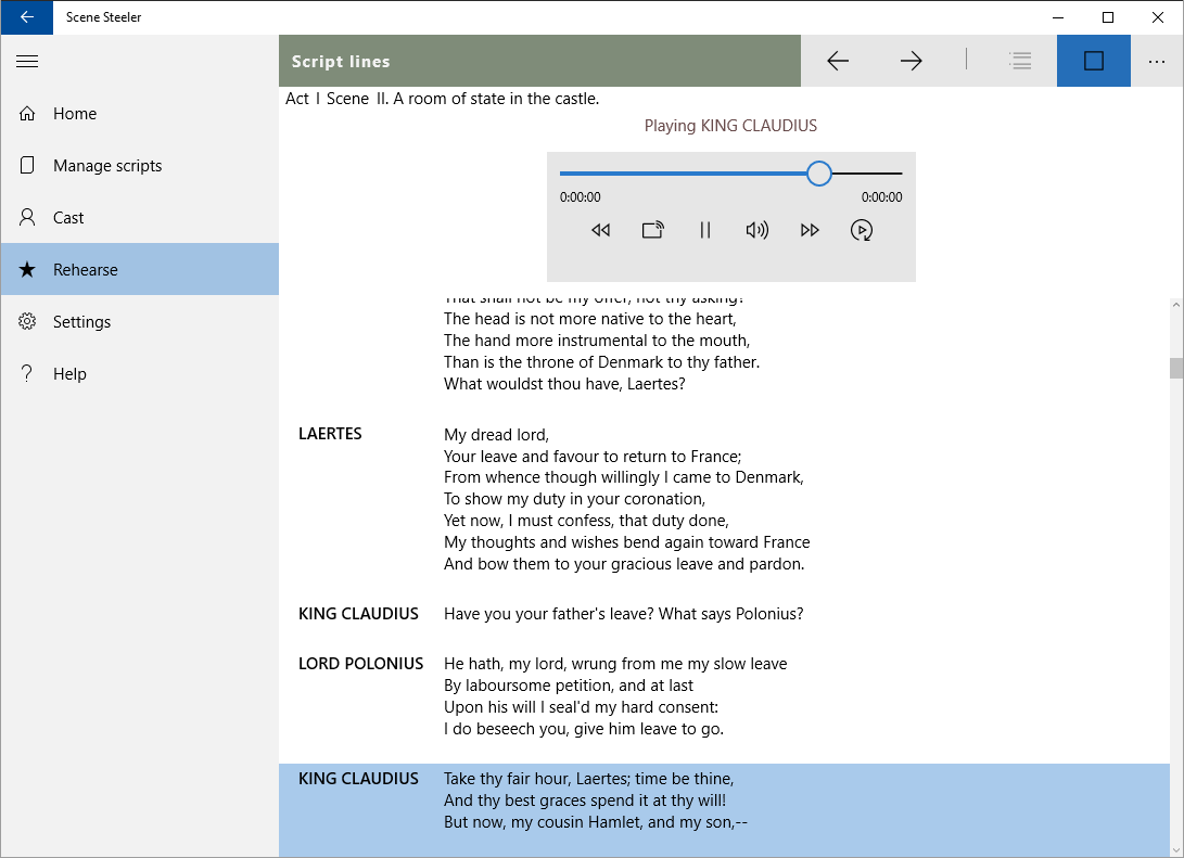 Import your script from a plain text file, with simple formatting rulesTag one or more characters as the ones you will be learning and playingSelect which voice to use for each character in the text to speech engine (install Windows language packs to get additional voices)Record yourself or your friends saying your lines and your cuesRead the script on screen with your lines highlightedListen to Scene Steeler read your cue lines, then practise saying your linesSay your lines along with Scene Steeler, or get Scene Steeler to pause then read out your lines so you can check if you got them rightHide your lines so you can try to remember them, then reveal them to check if you were rightWhile listening, use the media controls to pause, rewind, fast forward, adjust volume or make playback faster or slowerBuilt in Text to Speech using the Windows platform engineExport complete scripts to share with fellow cast membersApp tile in Start menu shows info about current scriptWorks on desktops, laptops, tablets and phonesScripts can be freely exchanged with Android and iOS versions, including any audio recordings of lines