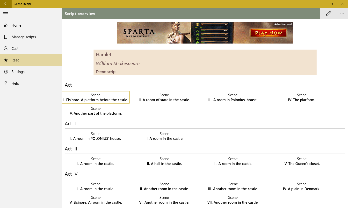 You will need the text of the script for the play you are in. Scene Steeler will import the text, identifying Acts, Scenes and the character parts. You tell it which character or characters are the ones you are playing.