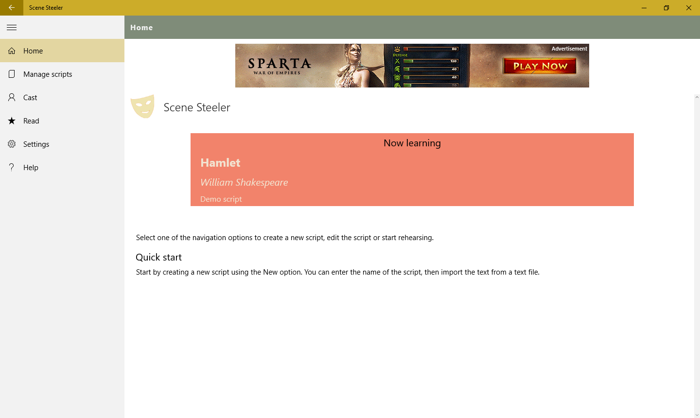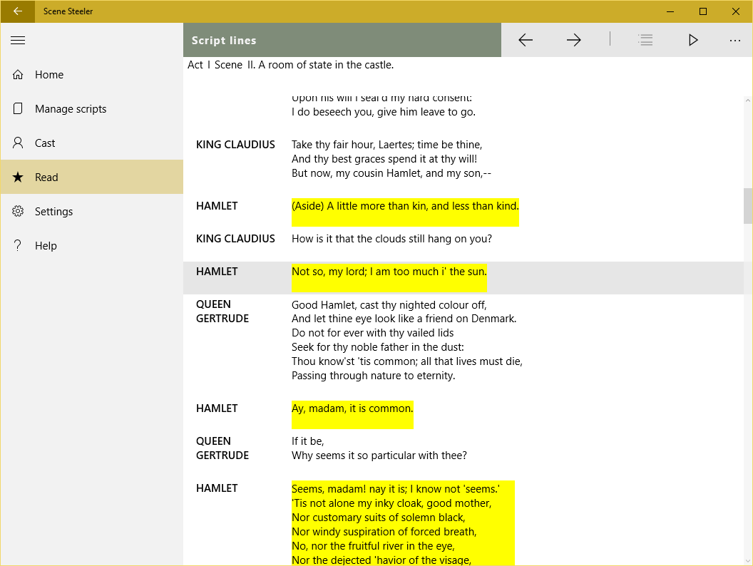 You've aced the audition and won a leading role. Fantastic, but... now you've got to learn all those lines! Scene Steeler can help. Load in your script and away you go.