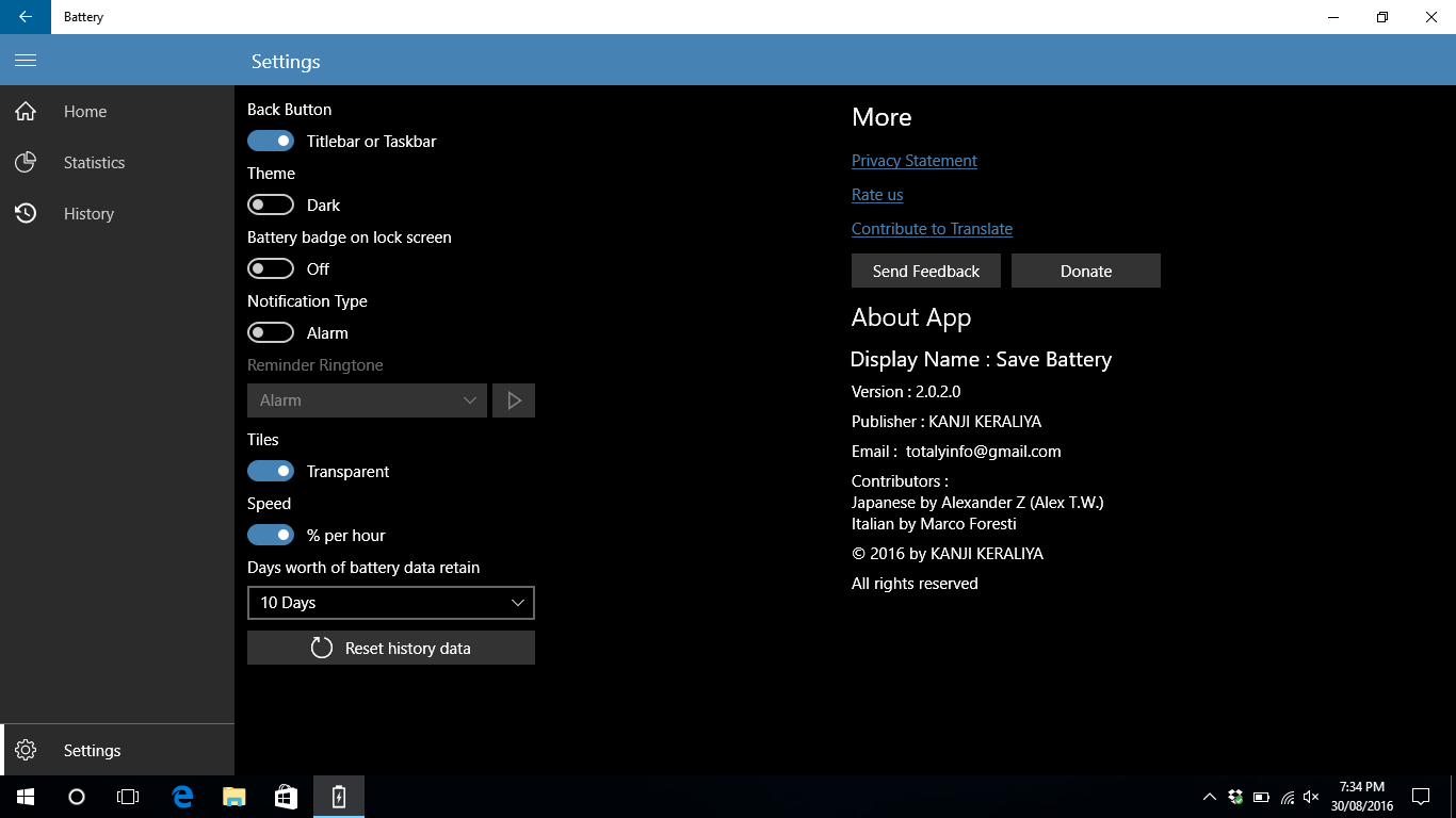 Display battery detailsBattery percentageRemaining battery balance timeEasy to use user interfaceStatus message about applicationFull battery notifications with soundDisplay battery status on live tilesFour types of live tilesDifferent types of notifications (when the battery is fully charged, when the battery is low)Badge of battery level on lock screenCharging history (List and Chart)Export battery historyStatistics, Battery monitor, Battery usage trackingSave Battery, Battery alert, Battery saverLow battery warning, Bull battery warning