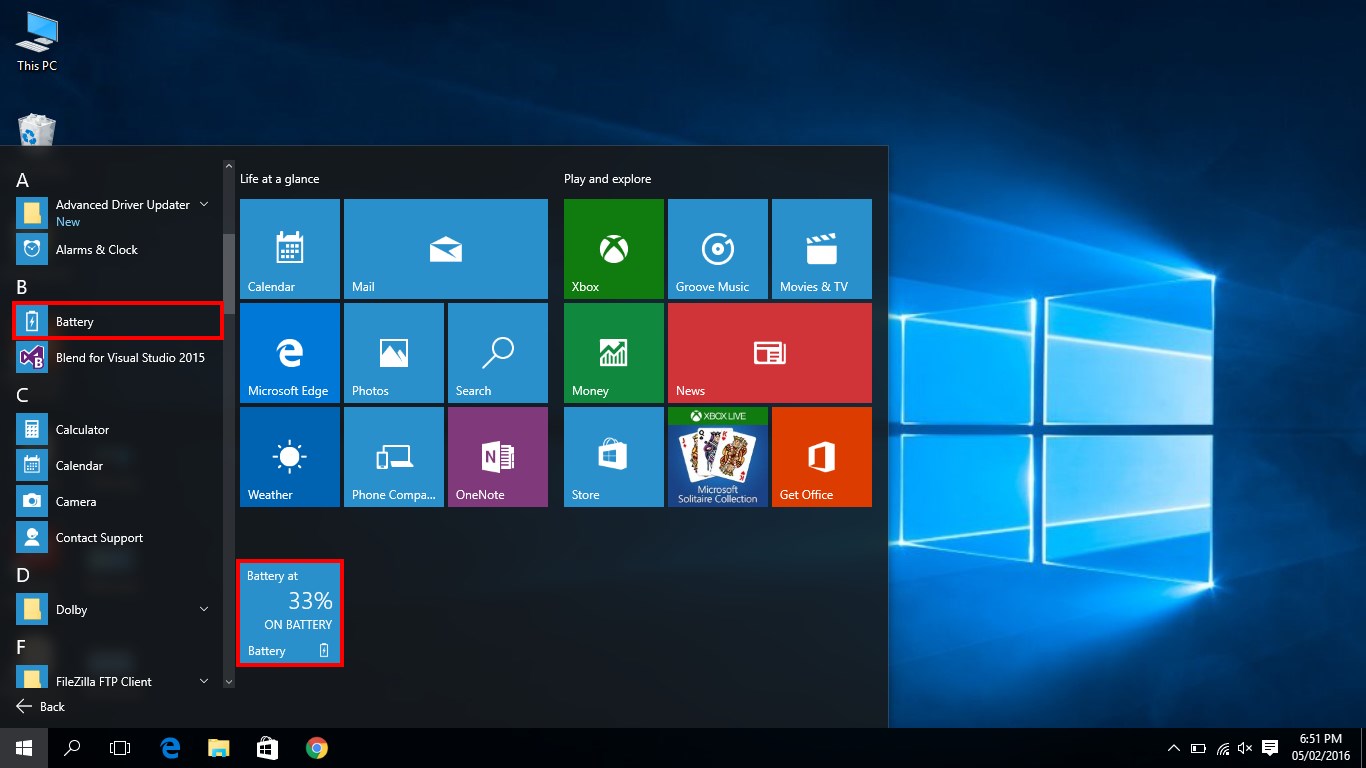 * Battery Live Tile showing the battery percentage on Start Screen