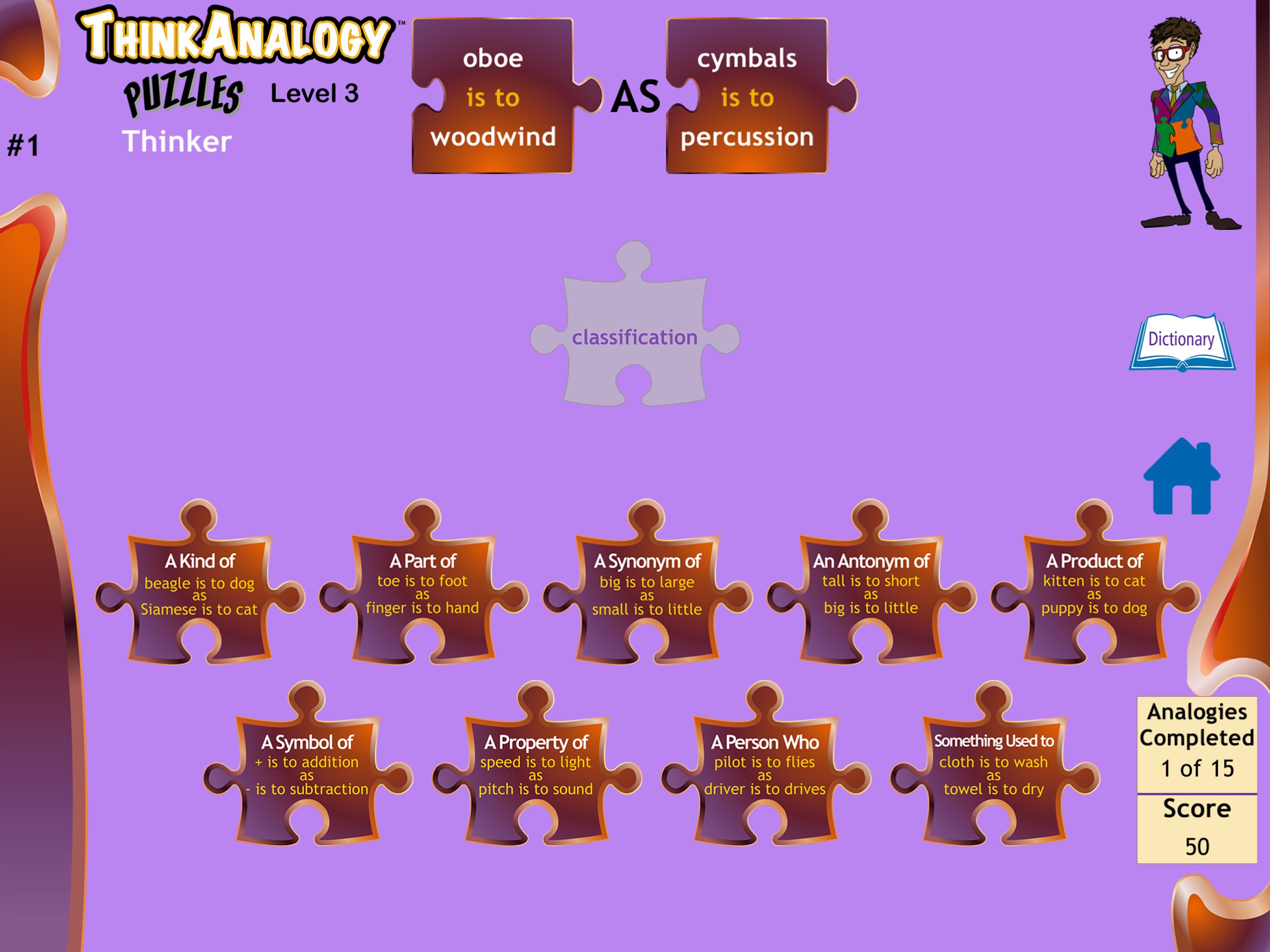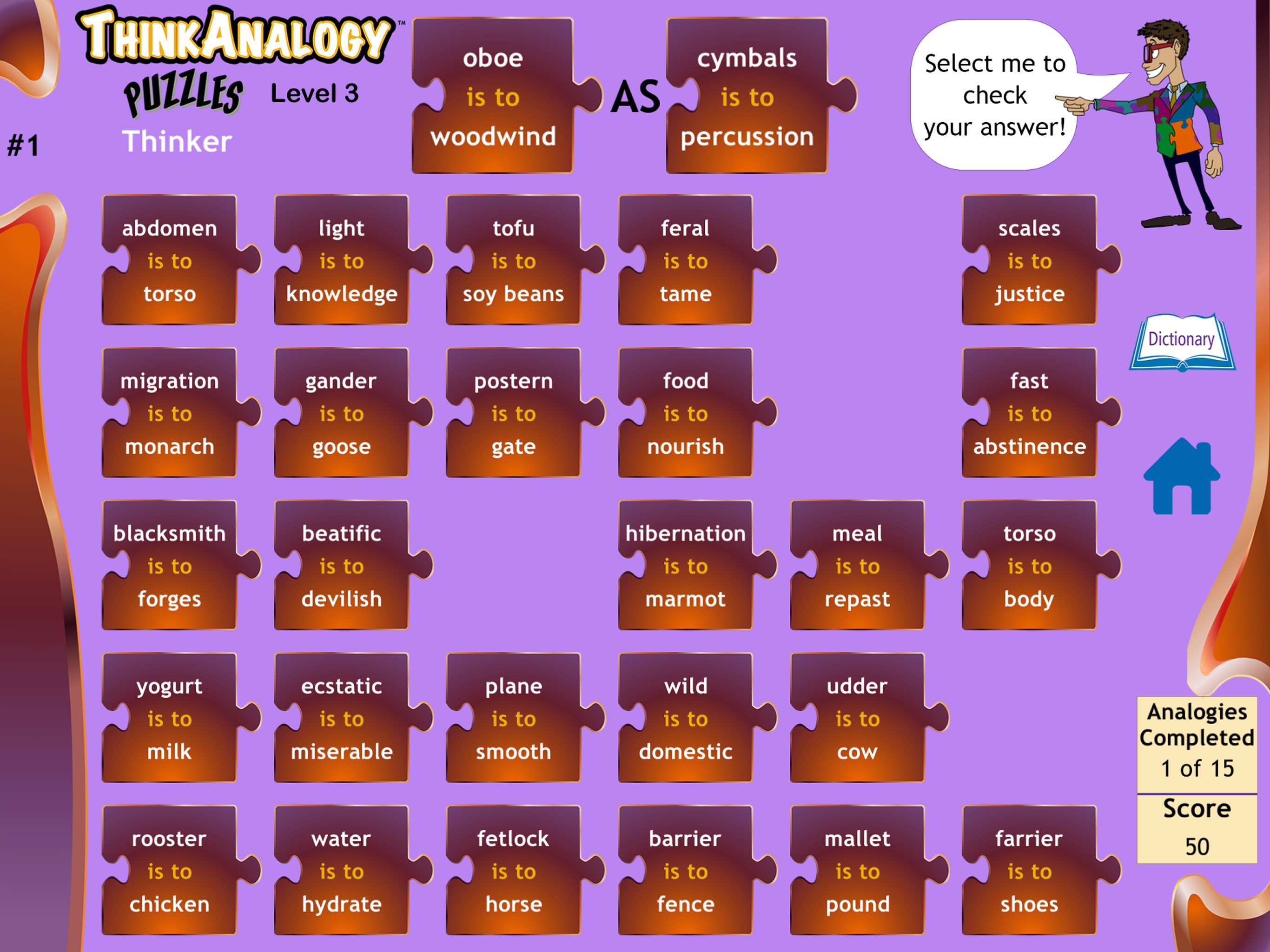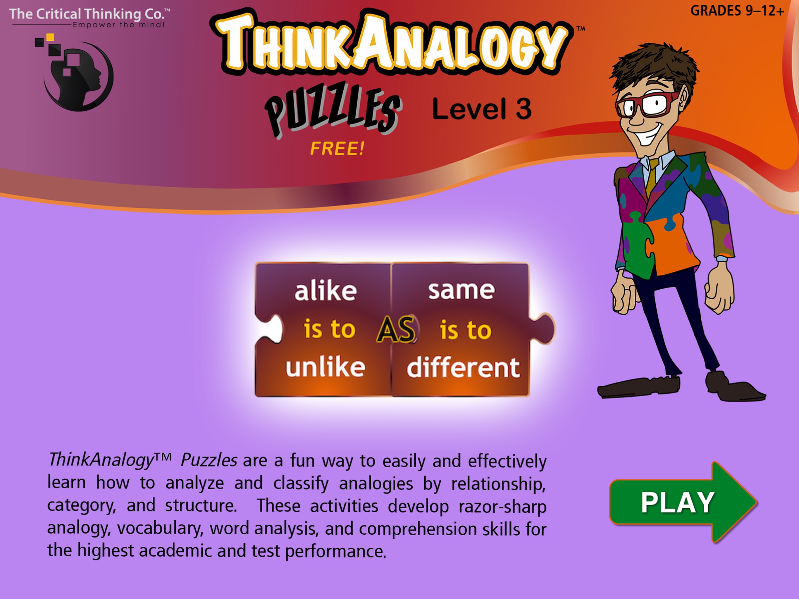 ThinkAnalogy™ Puzzles is a fun, engaging app that helps students truly understand the basis of an analogy. These activities develop razor-sharp analogy, vocabulary, word analysis, and comprehension skills for the highest academic and test performance.
