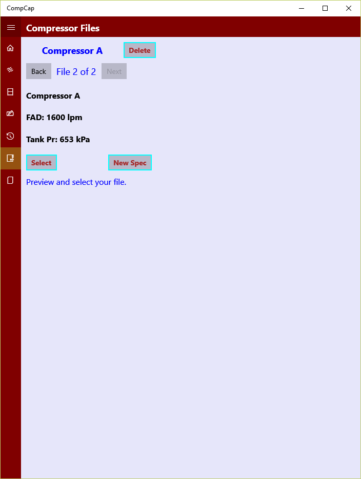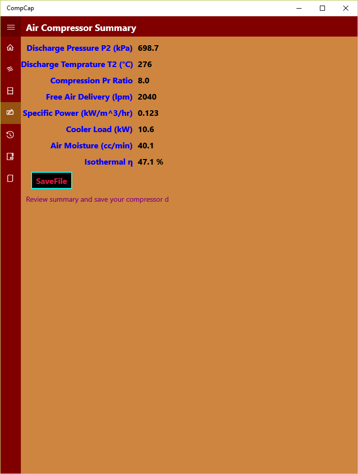 Home screen displays the key performance summary for the given compressor operating spec as shown in the screen shots. Additional information such as cooler load, moisture level, isothermal efficiency etc. are provided in a separate summary sheet. Users can review all the result summary and save the compressor data with specific title for future monitoring and review.