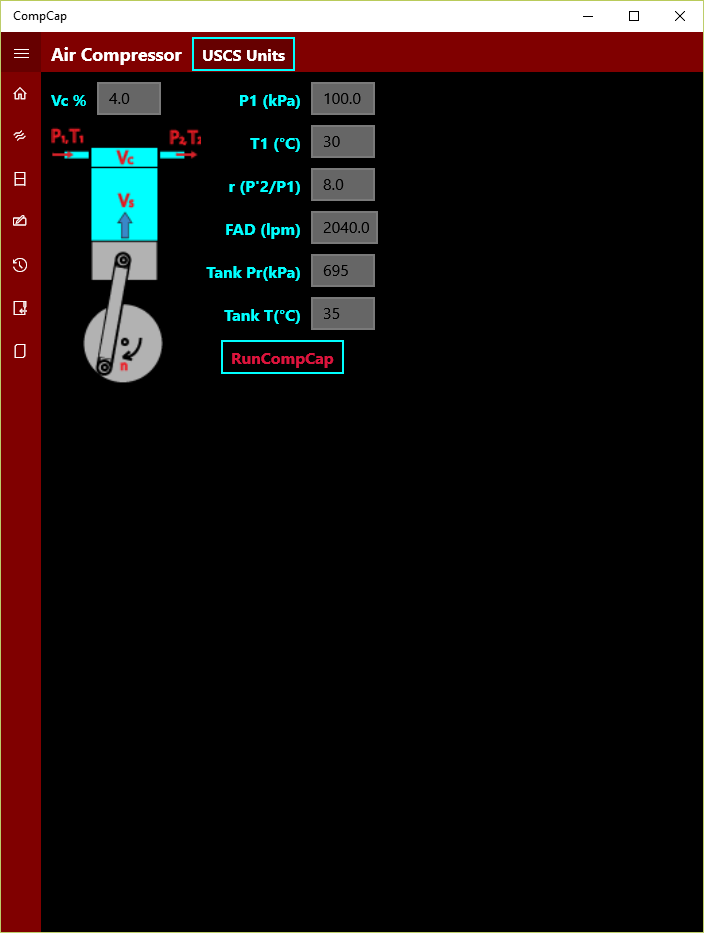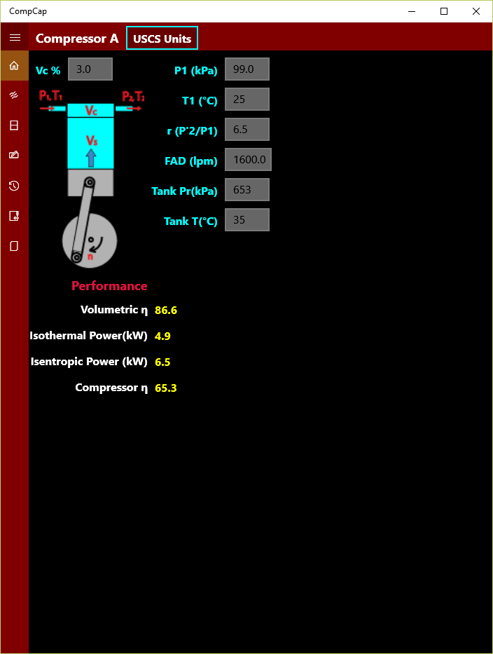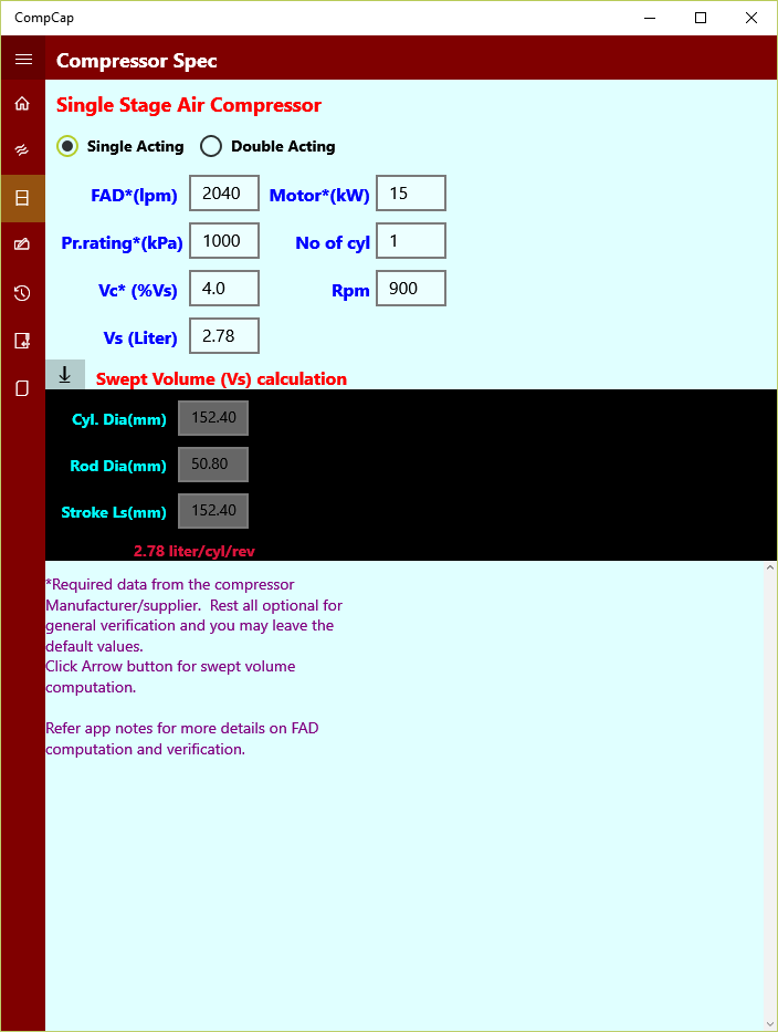 A typical compressor specification data sheet is show in the screen shot. FAD, motor horsepower and rpm data are the minimum requirement based on manufacturers data sheet. Additional data pertaining to reciprocating cylinder helps to determine the swept volume as well as range for FAD for general verification. Volumetric efficiency is given as function of cylinder clearance at TDC and pressure ratio. Clearance in compressors are generally in the range of 4% to 12% of total swept volume. Thus it also helps to determine actual free air delivery in a compressor. Users can work with both SI or USCS unit system.
