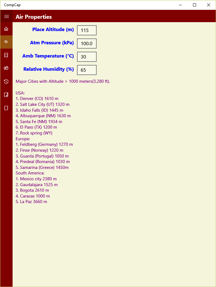 Ambient conditions such as atmospheric pressure due to altitude, temperature, and humidity got considerable impact on compressed air system performance. The app computes the atmospheric pressure for any given altitude. Data for some of the higher altitude (> 1000m) cities are also provided for convenience.