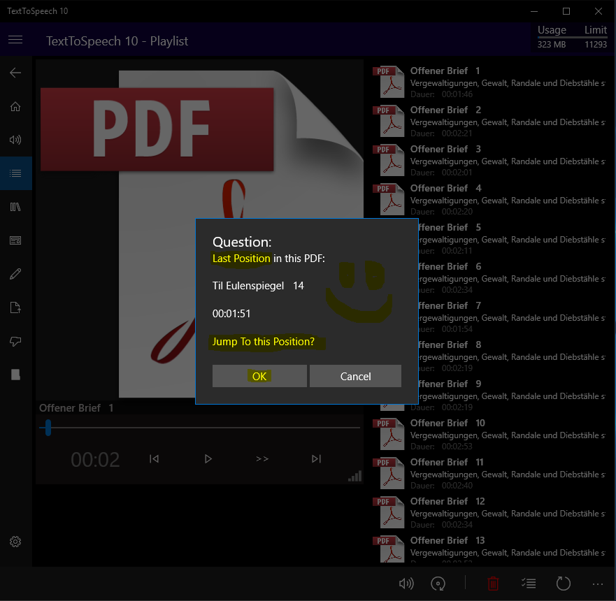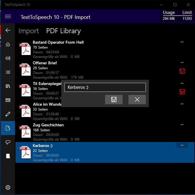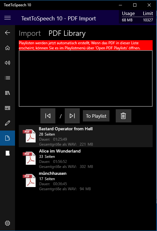 Activate it in Settings, NOT automaticly active!! Running Time is now shown (after the wave files are created). PDF-Library: External (Permanent) Store of Soundfiles: Mobile works, for Desktop i am Working on a solution. :))