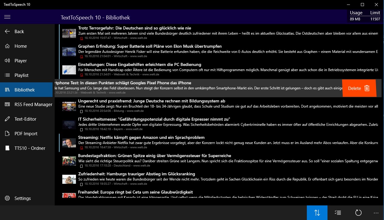 - TextToSpeech 10 will read aloud your pages / Playlists of pages, >> create Playlists.