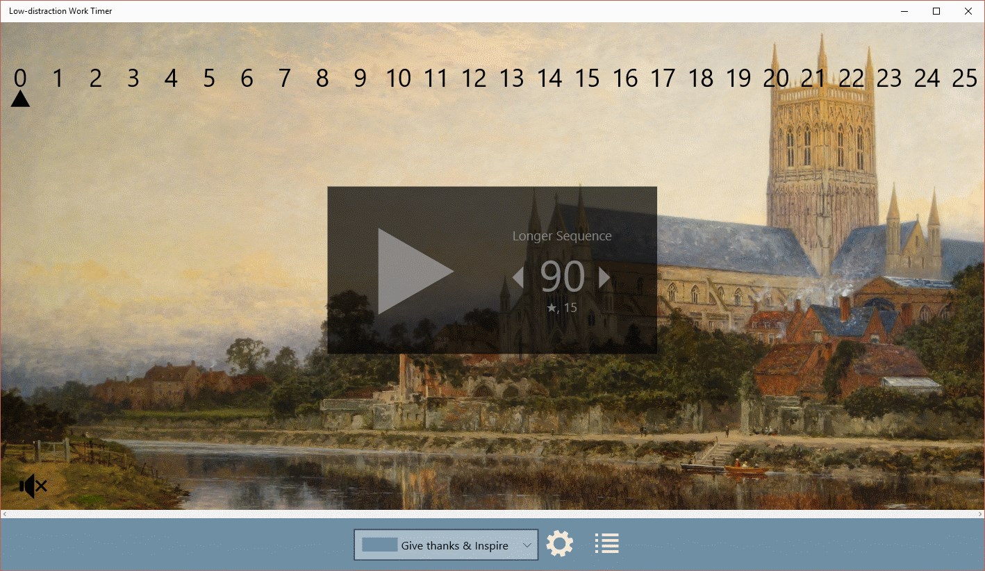 The low-distraction work timer helps you focus on your work, not your tools. Press “play” and the timer slowly counts up to 25 minutes, reminding you to focus on your task. After each work period, refresh your brain with a brief 5-minute task. The timer is ideal on a companion phone device; keep in next to your main work area so that you always know what you should be working on.