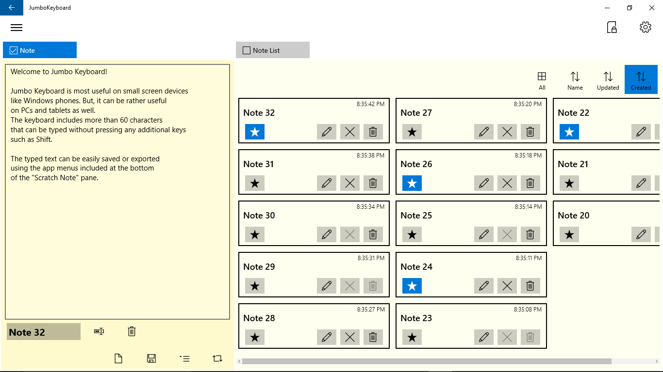 Large virtual keyboard for faster typing.Keyboard includes both English alphbets and numbers/symbols.Typed text can be saved, shared, or exported for further consumption.Provides sticky notes functions.Notes can be pinned to a start screen.Recently viewed notes is added to Action Center.