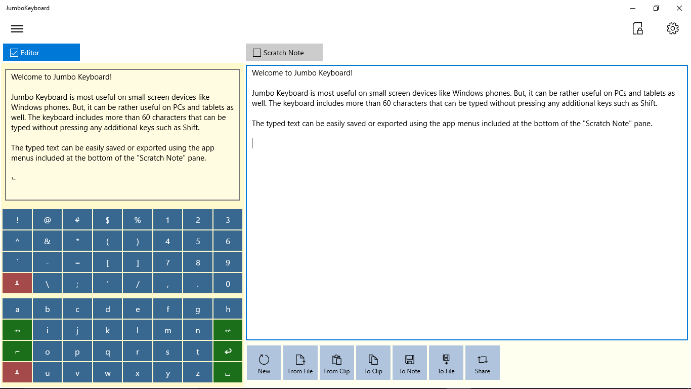 The jumbo keyboard editor currently includes a pair of keypads for English alphabets and symbols and numbers. Typed texts can be saved as notes or they can be exported to files, or they can be copied to clipboard, etc. Note that the jumbo keyboard editor currently provides a rather limited editing functions. You can only append text at the end (and, delete characters from the end, using Backspace). The primary purpose of Jumbo Keyboard is to help you type a short text quickly (e.g., to send it as a text message), especially on small screen devices.