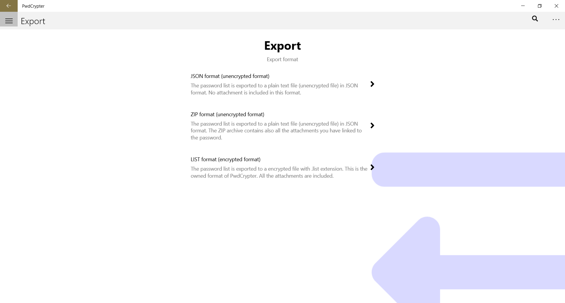 - import and export of the list of password in the following formats: JSON, ZIP and LIST (proprietary file format of PwdCrypter);