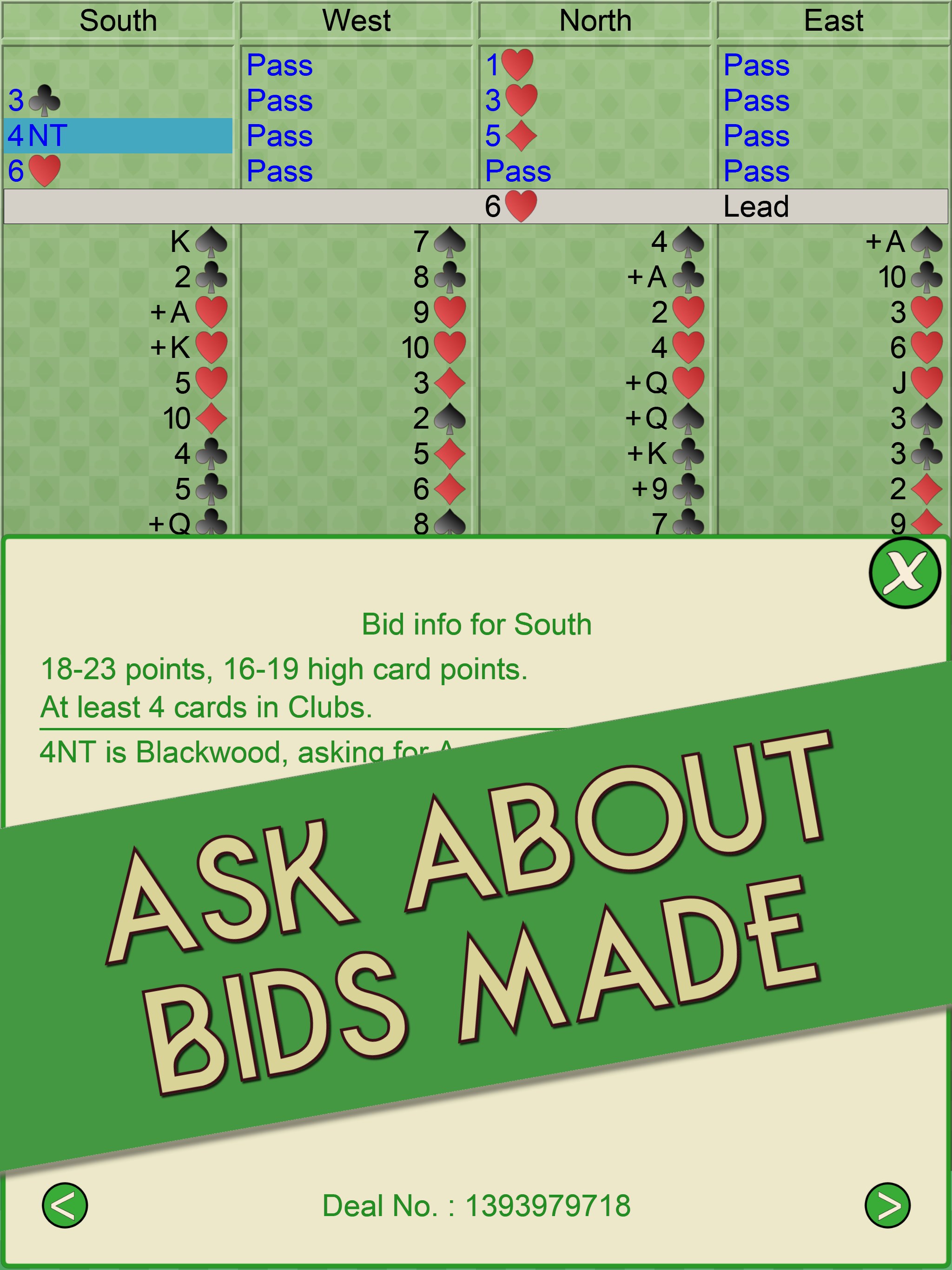 Addition of 2 new bidding conventions, 2-over-1 and weak jump overalls. Numerous minor improvements to game presentation. Displays a summary of the hand scores at the end of tournaments. Significant update to the online bidding guide given the impact of two new conventions.