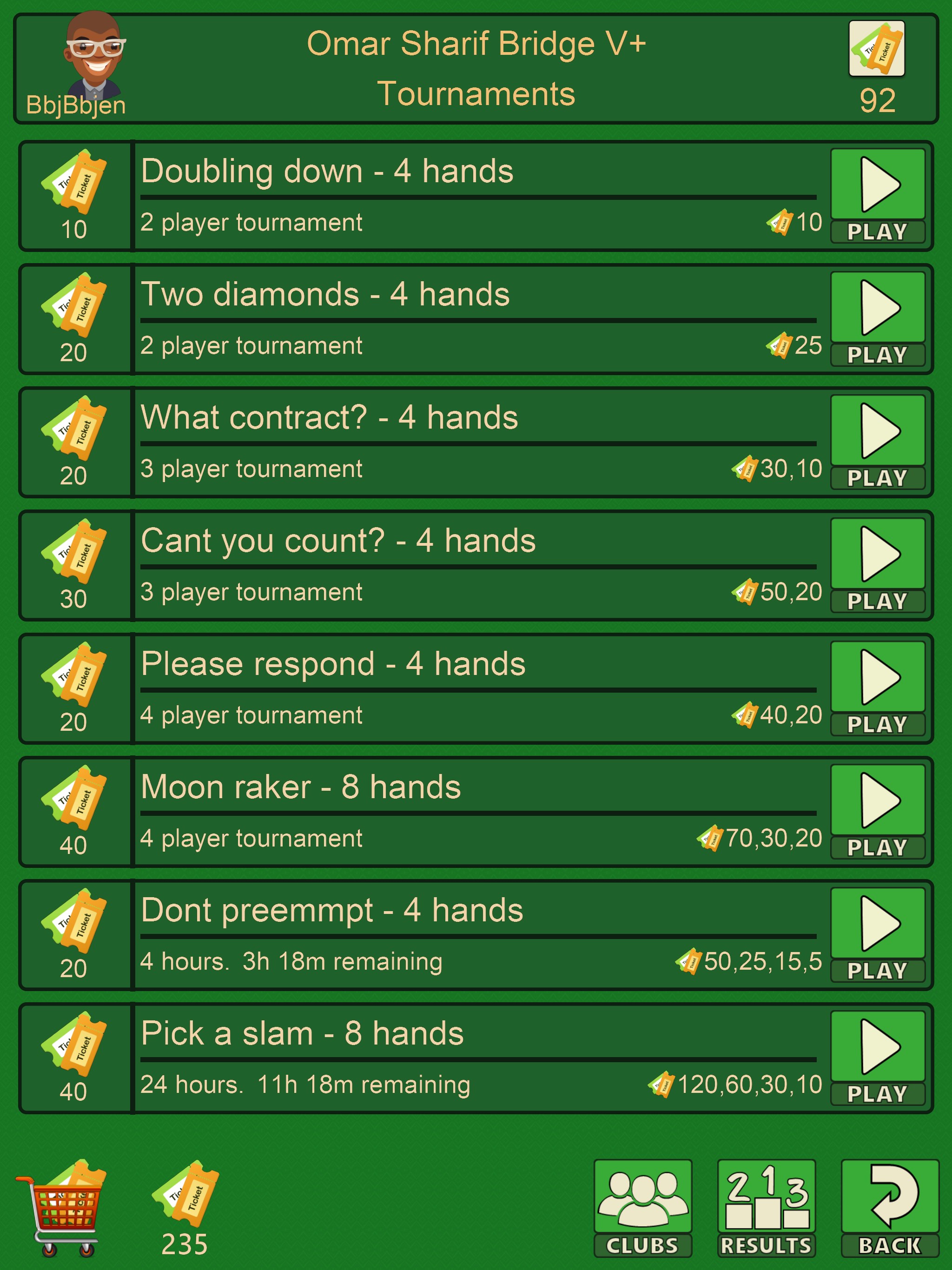 Please NOTE: Bridge tournaments cost money to host and run. You can purchase Ticketz to enter tournaments using the In App Purchases available.