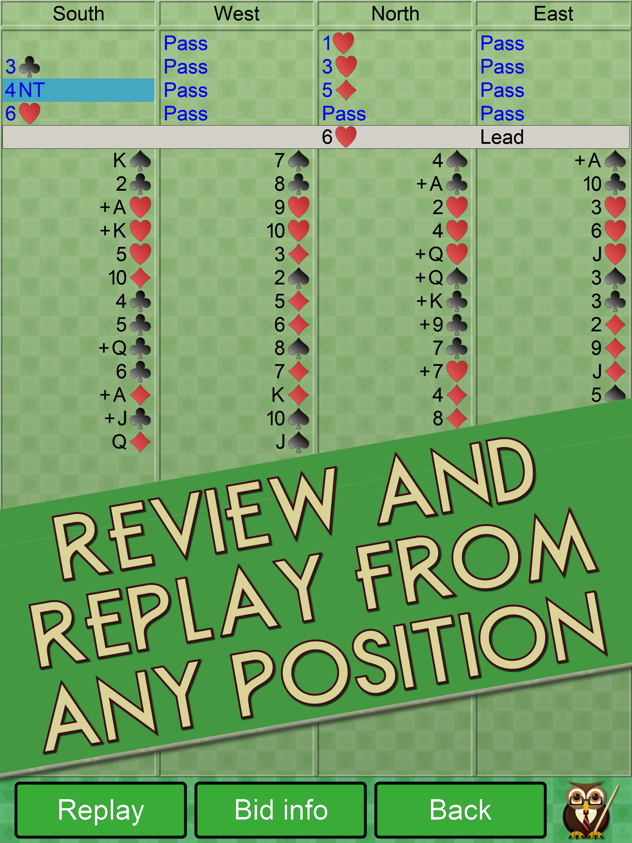 Designed for both beginners and more advanced players you can choose how you prefer to play. There are plenty of features if you are trying to learn Bridge including auto play and hints. Meanwhile the more advanced players can use the bid analysis or replay hand features to explore different lines of card play.