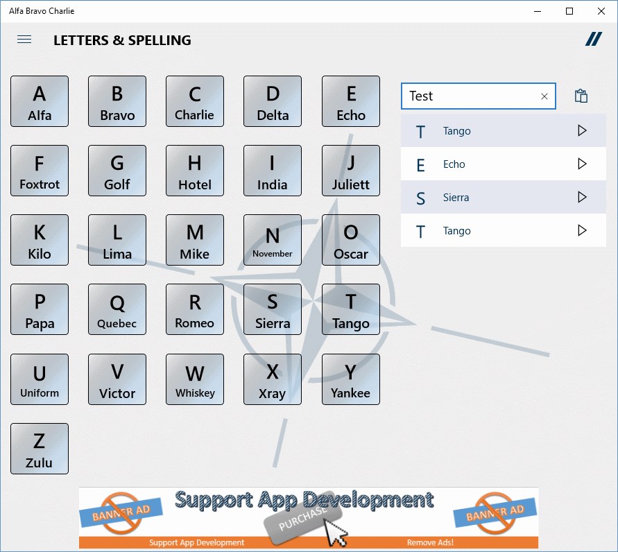 This essential tool unlocks the power the NATO phonetic alphabet by providing both a quick look up table where clicking on a letter will speak the word and a feature which spells out the entered text. Charlie - Oscar - Oscar – Lima!