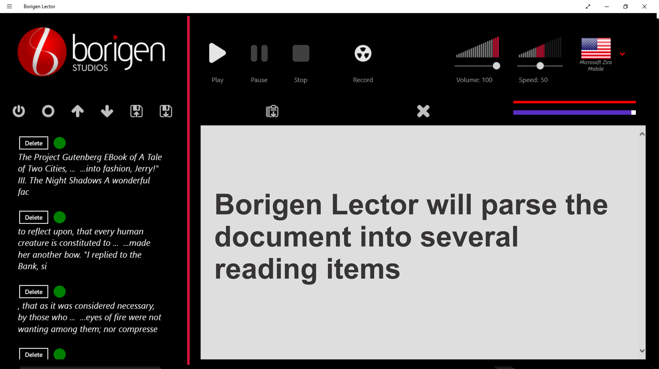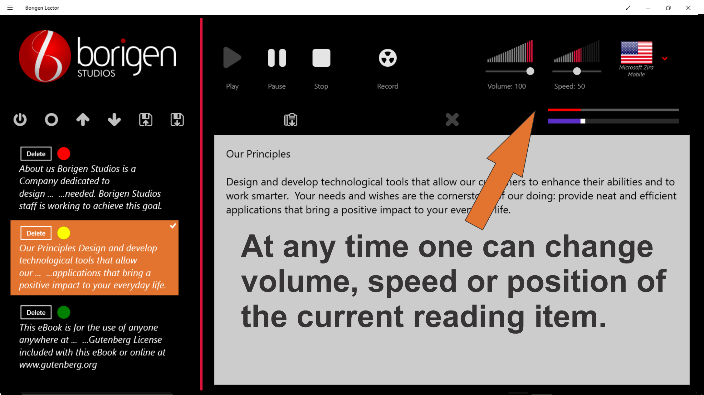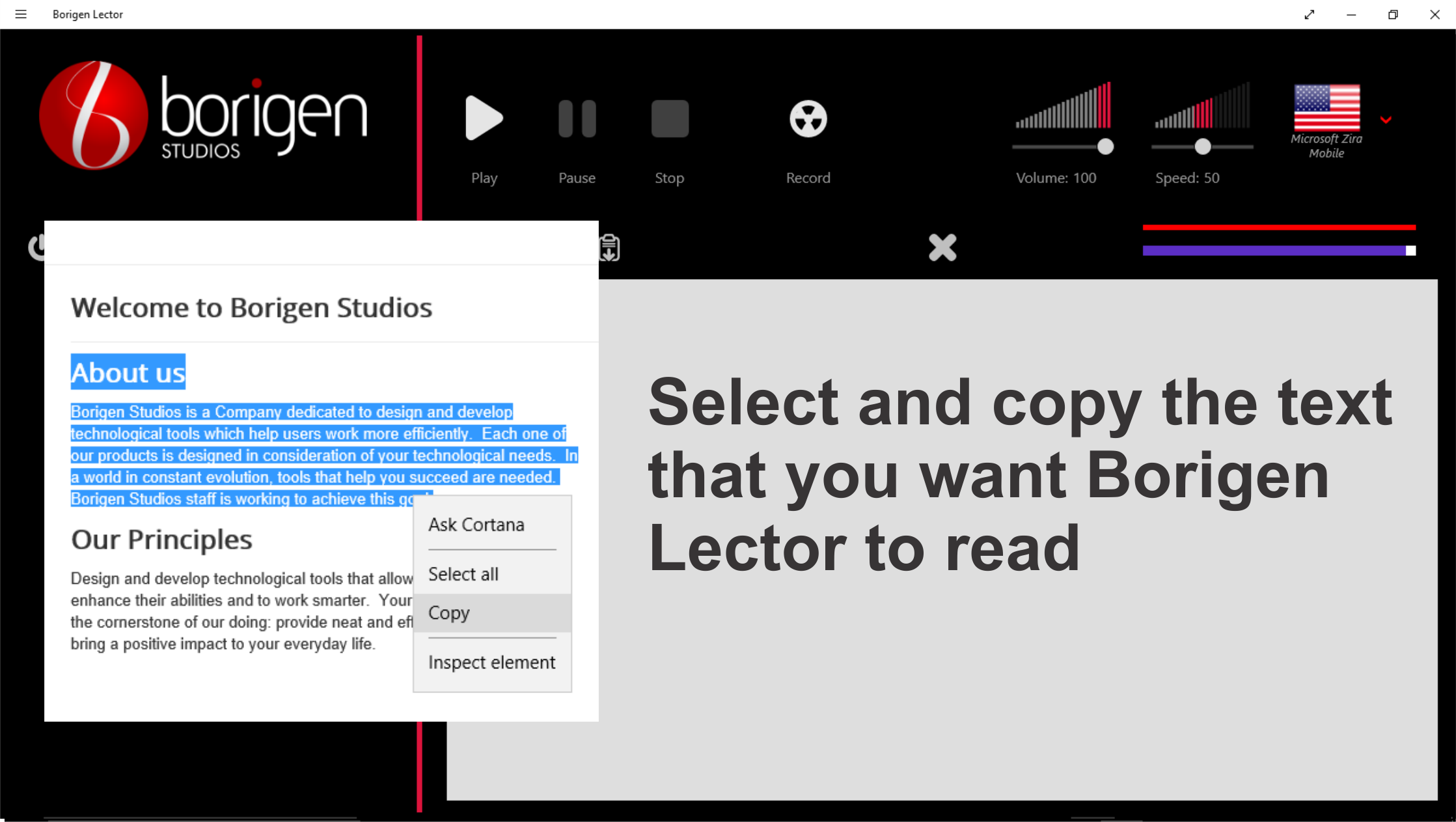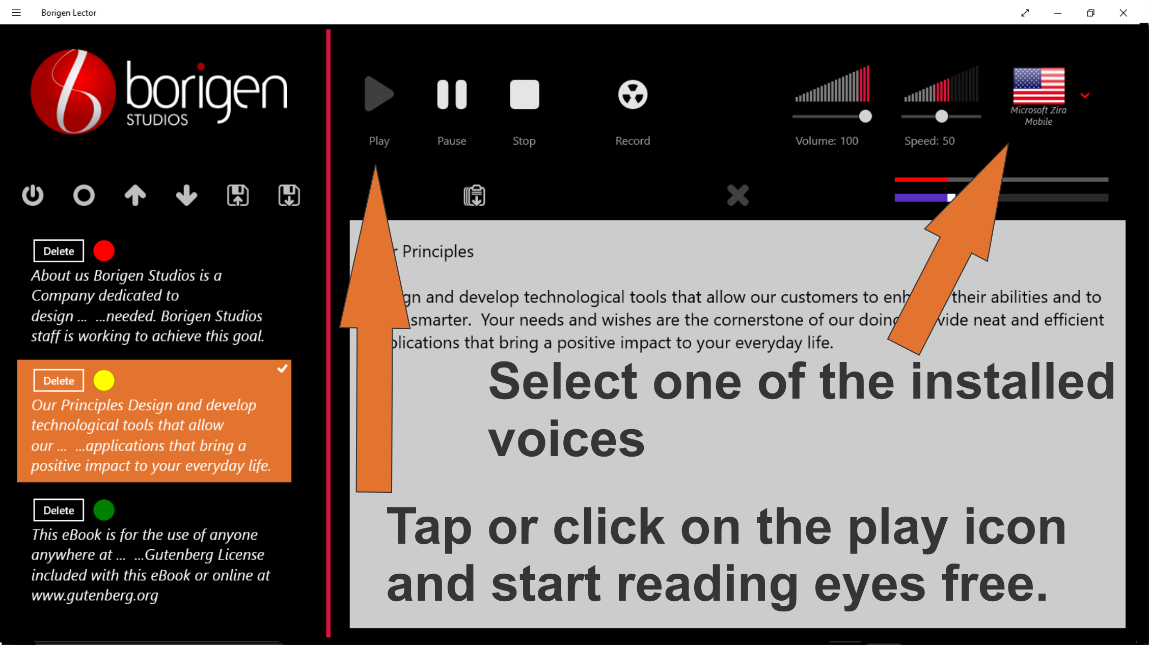 Borigen Lector is a tool designed to help you multitask, in the traditional way or reading, one only can handle a piece of information at any given time, by the use Borigen Lector you would be looking for the next piece information, while already been “reading” a text. Just press or click the “Start capturing” button and Borigen Lector will stack all the text that you place in the windows clipboard (select a text and copy it, if selectable), choose a language by selecting one of the speech voices installed in your system, set the speed and volume, press Play and enjoy of the pleasure of reading while your hands and eyes are free to engage in other activities.