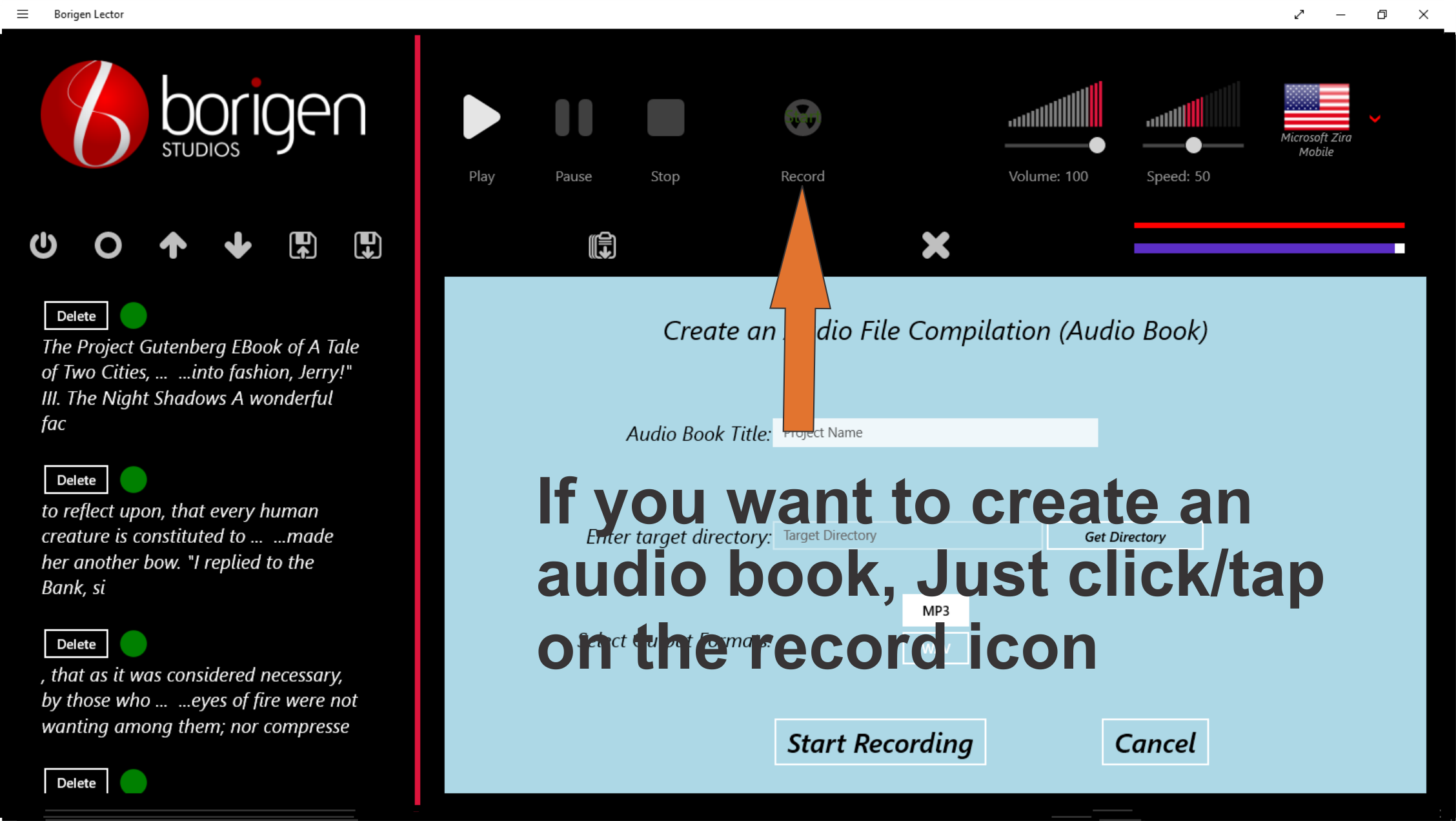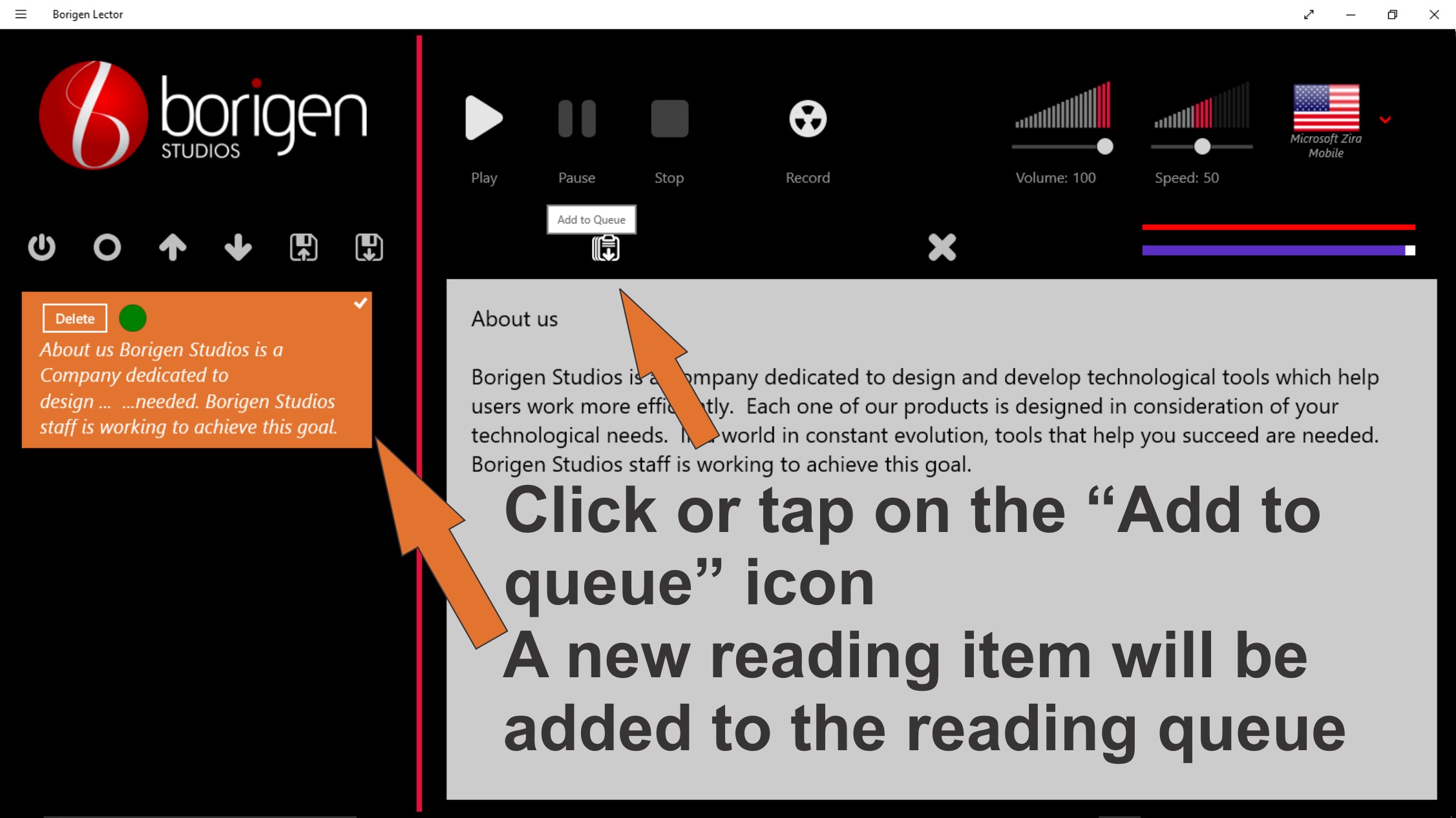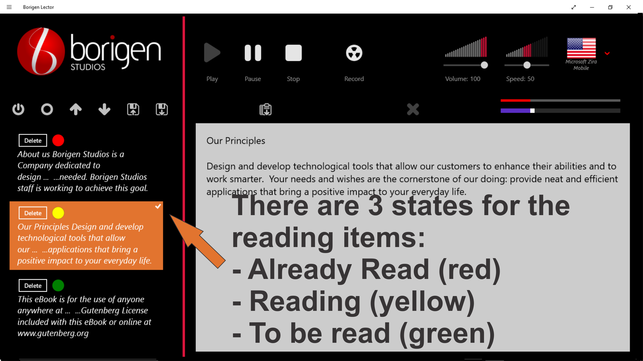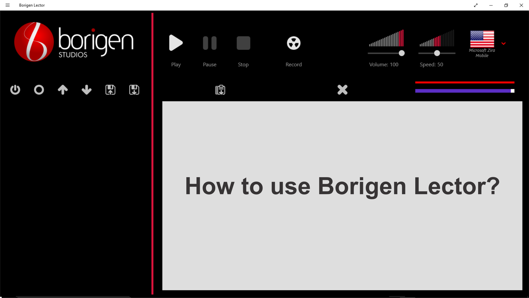 Borigen Lector is a tool designed to help you multitask, in the traditional way or reading, one only can handle a piece of information at any given time, by the use Borigen Lector you would be looking for the next piece information, while already been “reading” a text. Just press or click the “Start capturing” button and Borigen Lector will stack all the text that you place in the windows clipboard (select a text and copy it, if selectable), choose a language by selecting one of the speech voices installed in your system, set the speed and volume, press Play and enjoy of the pleasure of reading while your hands and eyes are free to engage in other activities.