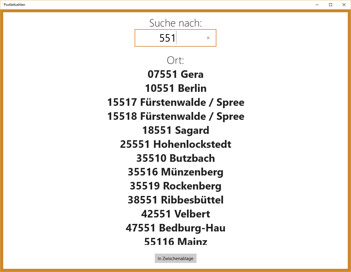 Über die Eingabe einer Postleitzahl wird sofort der Name der dazugehörigen Stadt ermittelt. Gibt man den Ortsnamen ein, so wird die dahinterliegende Postleitzahl ermittelt.