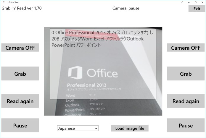 文字読み上げカメラのアプリケーションです(Windows 10用)。視覚障害者が看板やチラシなど様々な物体の写真を撮ることで、書かれた文字を認識し、音声に変換して聞くことができます。識字障害者にも有用かもしれません。