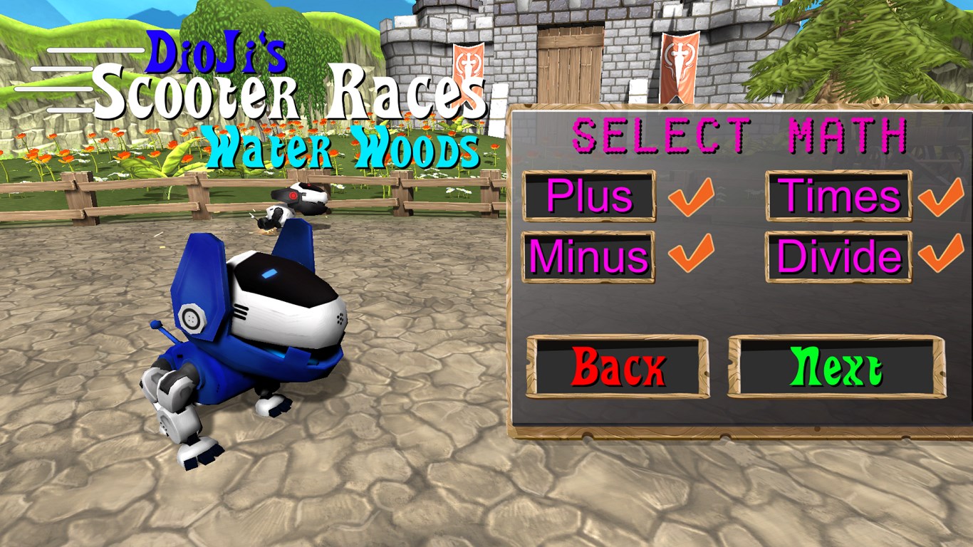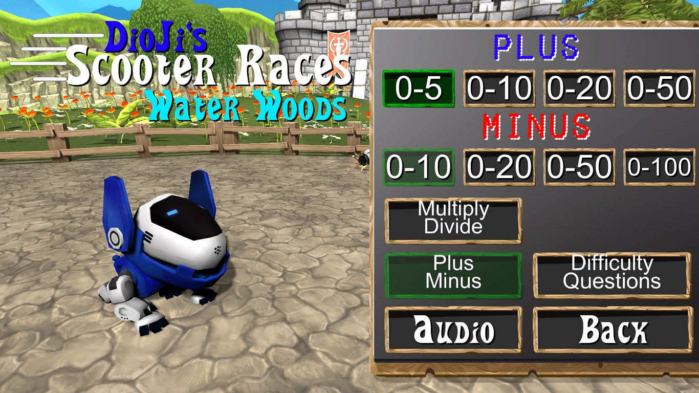 DioJi’s Scooter Races is a math based educational aid where children compete against the computer to complete math facts including addition, subtraction, multiplication, and division. Depending on the area the math is presented in different ways. Players can earn stars for completing and getting correct answers during the races which can be used in the Star Store within the program to unlock other areas puppies and music. There is no in app advertising or purchasing (stars used in the games store are only earned by getting correct answers and can not be purchased).