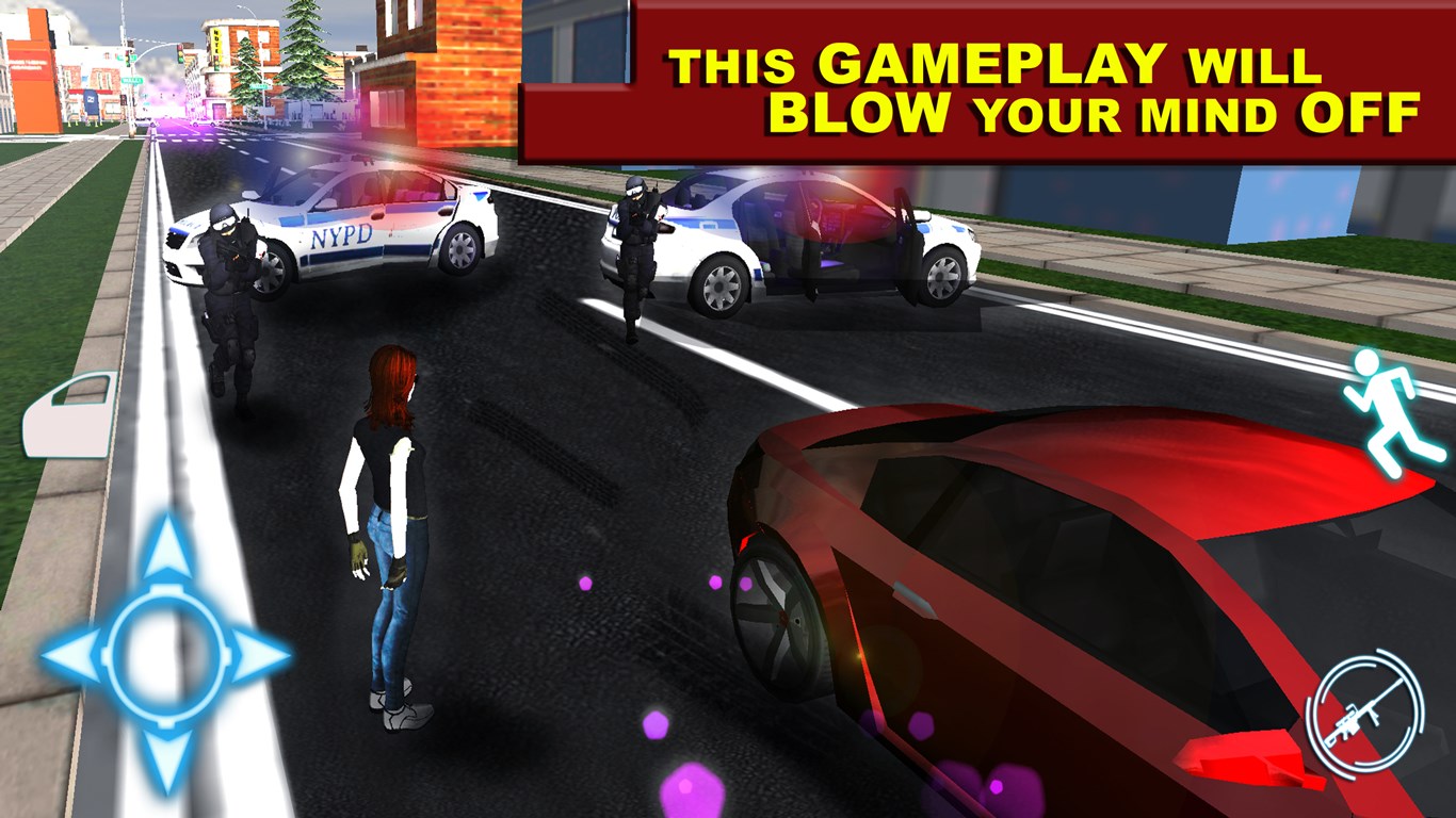 Free roam GANGSTER GIRL against rivals in New York with your crew as crime life gangsters, completing objectives, evading police encounters driving cars, don't get caught, the best action crime simulation with shooting experience.
