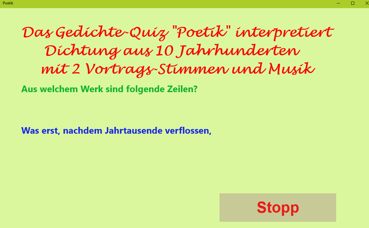 Das Gedichte-Quiz „Poetik“ interpretiert Dichtung aus 10 Jahrhunderten mit 2 Vortrags-Stimmen und Musik. Mehr als 1100 Gedichte aus 10 Jahrhunderten kann die App „Poetik“ auswendig. Nach dem Zufallsprinzip sucht sie daraus einige Zeilen aus, diese werden vorgetragen. Danach folgen ein paar Takte Musik. In dieser Zeit kann versucht werden, den Dichter zu ermitteln. Anschließend erfolgt die Auflösung.