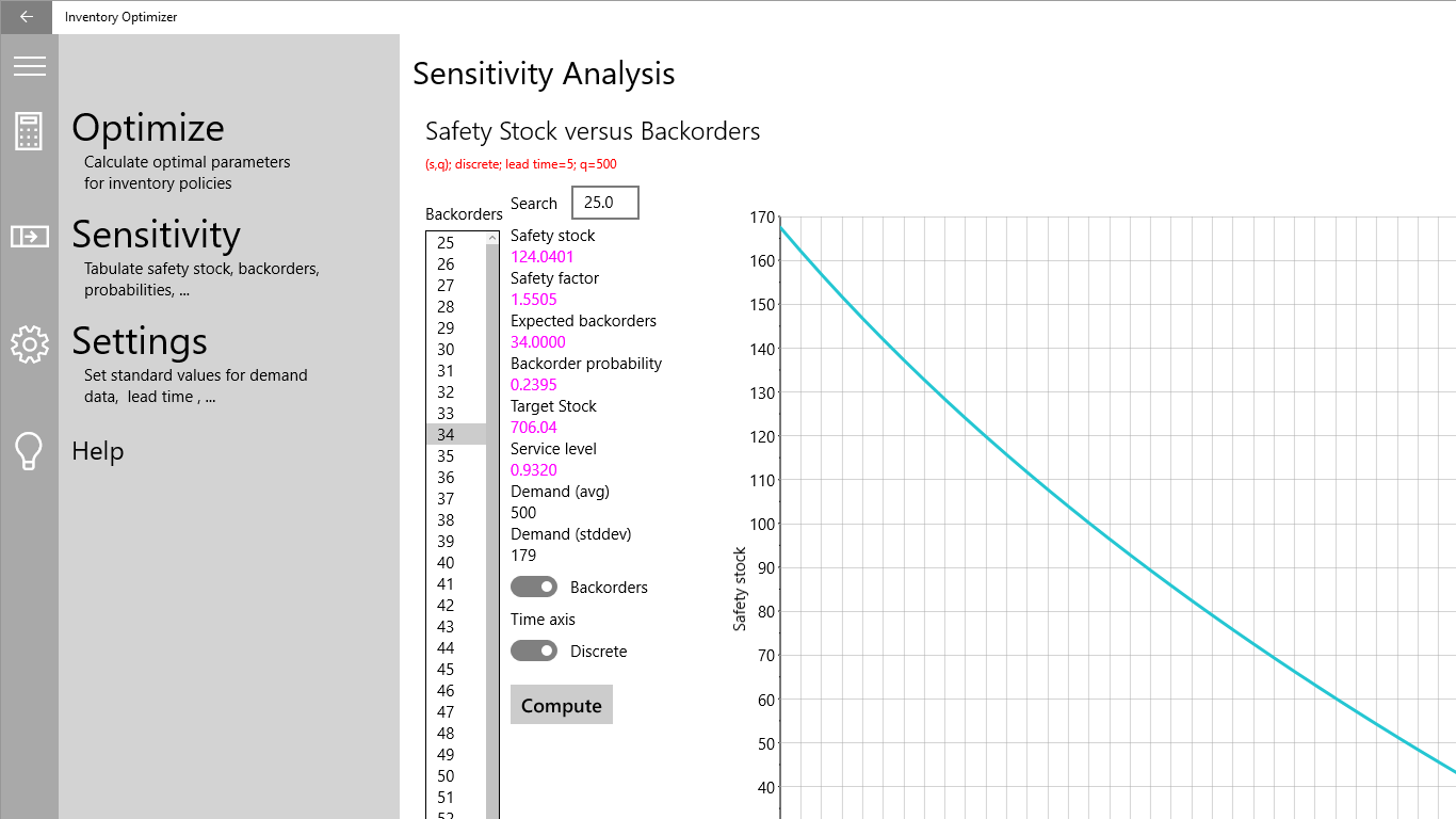 Calculates correct parameters of inventory polices(s,q), (r,S) and (s,S) supportedPerform sensitivity analyis (backorders vs safety stock)Regular and erratic demandContinuous and discrete time axis