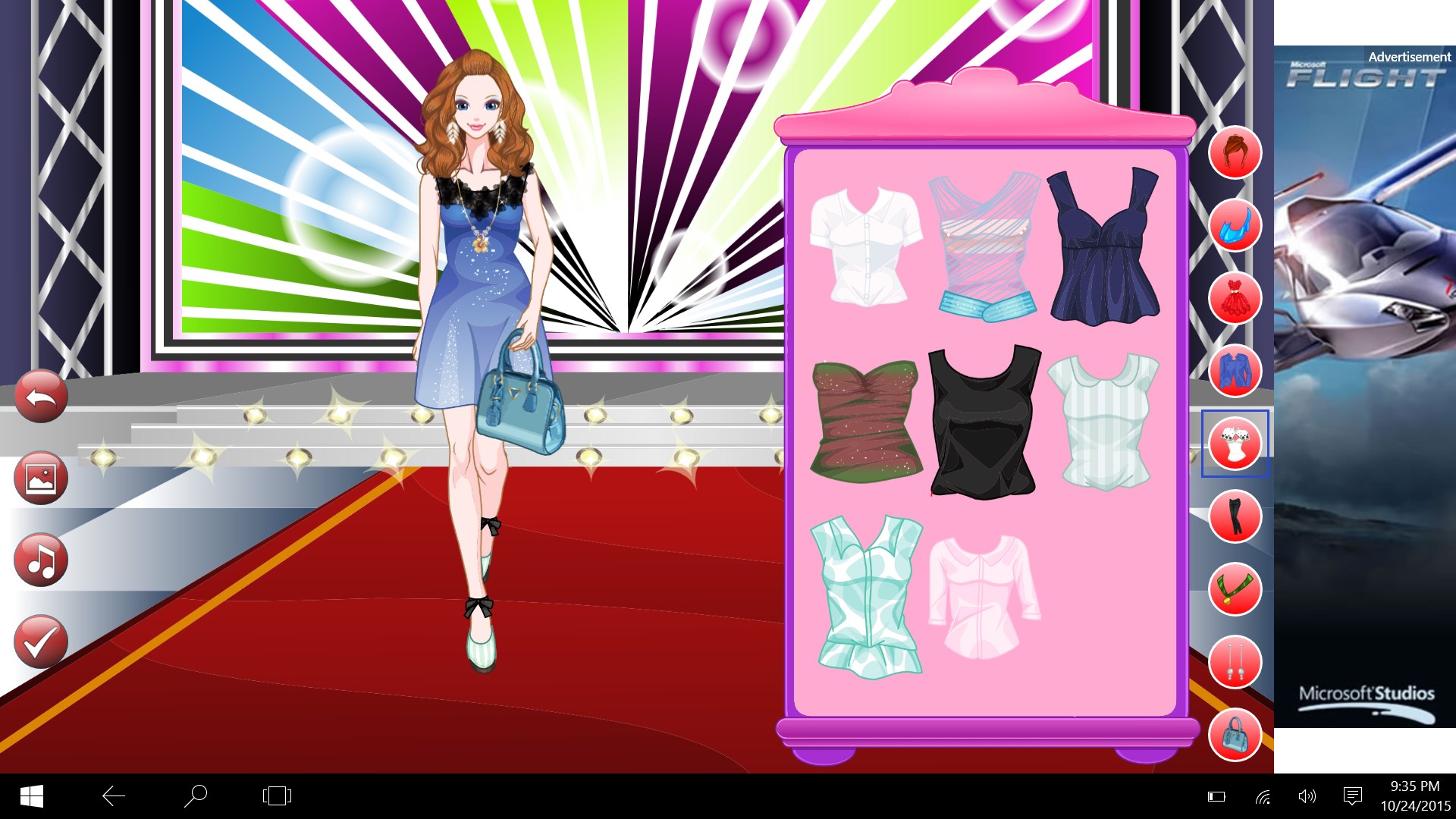 Design the fashion model whole look for a photo shoot! Choose her hairstyle, her clothes and shoes... Then complete the styling be trying out accessories like earrings, glasses, scarves and other things!