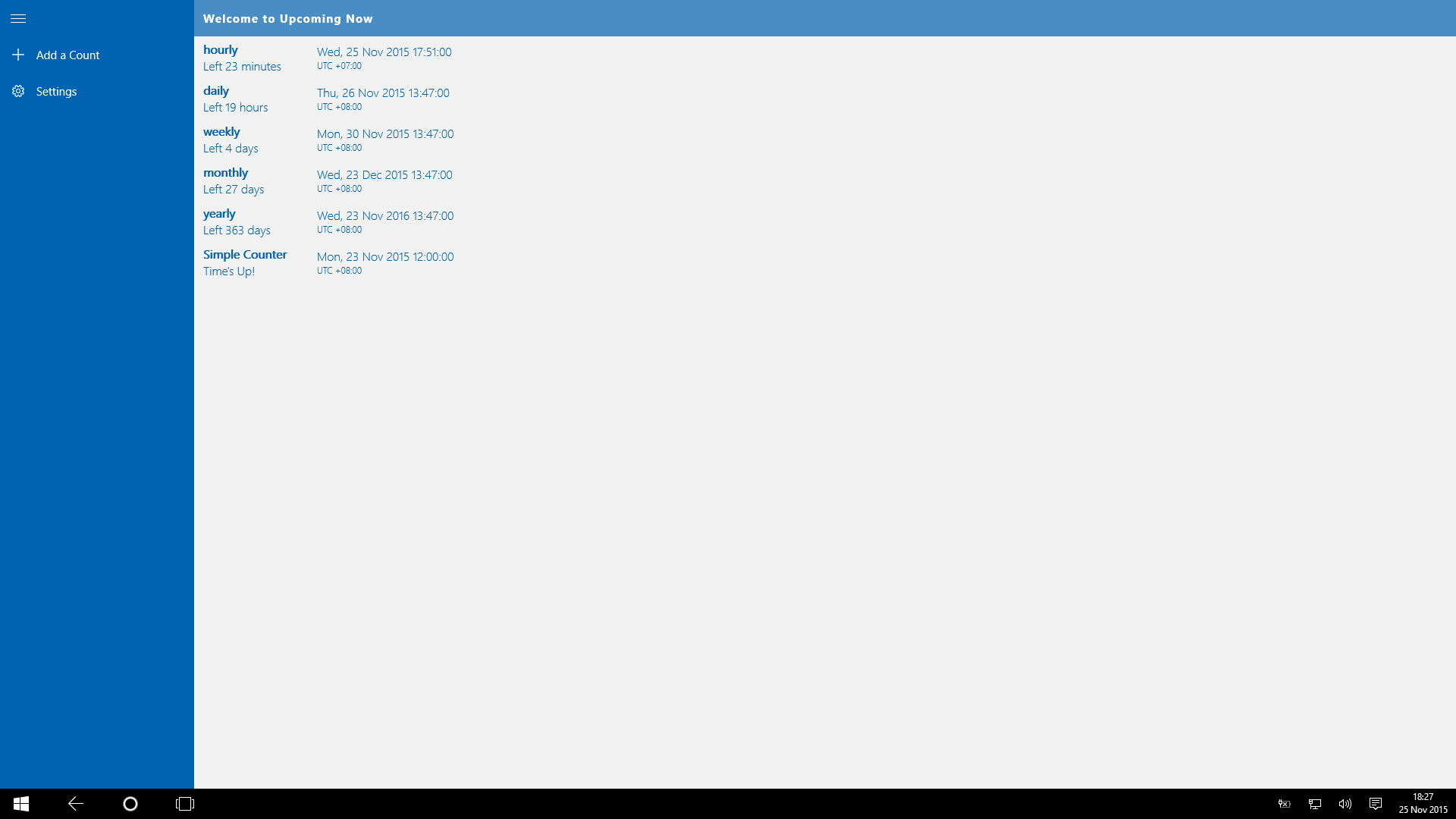Upcoming Now is a simple and free date/time counter. It does countdown to your upcoming events. It does count up to your passed event as well, like how long you've live in this world. By utilizing leverage of Microsoft Account, Upcoming Now syncs your saved counts on the cloud and sync it across devices when you are using the same Microsoft Account.