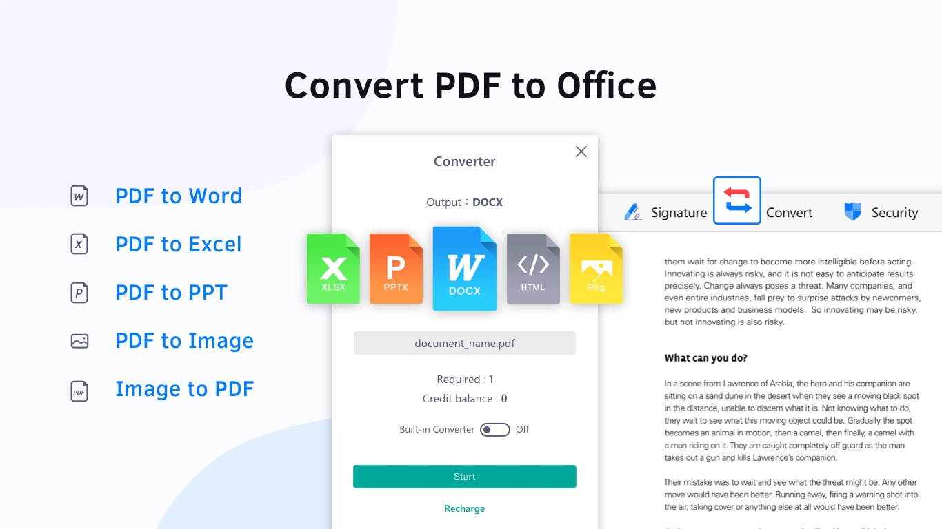 • Support PDF to Word, Excel, PPT, text, image & eBook conversions (docx, xlsx, pptx, png, txt, rtf, ePub, AZW3 & MOBI)