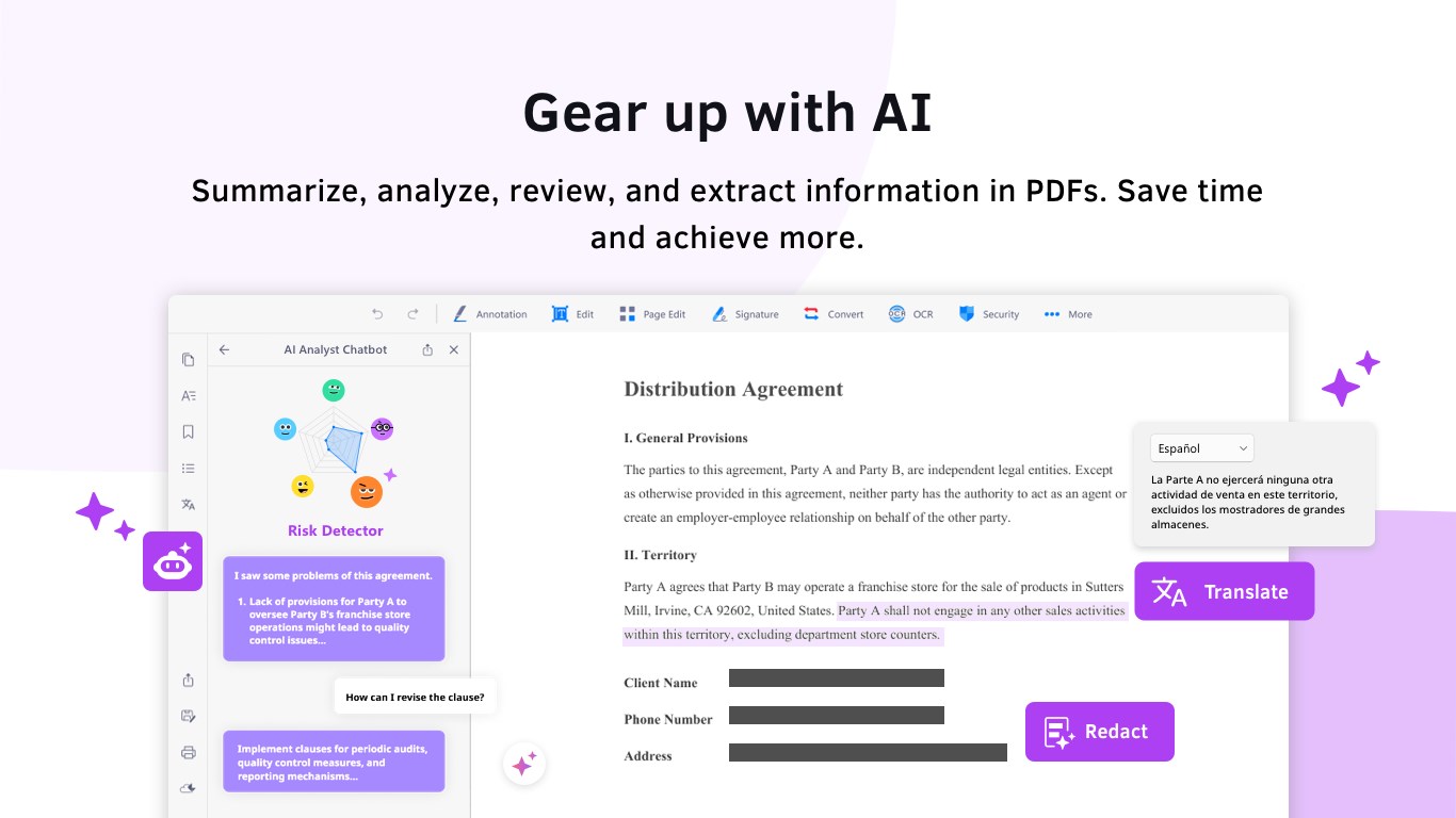 AI Features: AI Chatbot, AI text redaction, AI data extract, translationPDF Converter - Convert PDF to Word, Excel, PPT, text, image & eBook files (docx, xlsx, pptx, png, txt, rtf, ePub, AZW3 & MOBI).PDF Editor - Edit text, images and pages directly within PDFs.OCR PDFs - Turn scans & images into editable and searchable texts and PDFs.Encrypt PDFs - Protect your PDFs with passwords.PDF Security - Flatten all annotation objects or add watermarks to prevent them from being edited.Fill forms in PDFs - Fill docs and forms without printing.Sign PDFs - Sign your documents with your own signatures or freehand writing.View PDFs - Change background color. Present a PDF as a slideshow.Annotate PDFs - Markup PDFs with highlights, underlines, strikeout text, shapes, sticky notes & text boxes.Advanced Markups - Insert stamps, images and links to PDFs.Compress PDFs - Customize and reduce the file size.Split and merge PDFsPage Editor - Rotate, delete, add, and rearrange page order in PDFs.Support Windows Ink Toolbar - Use freehand drawing and writing with a pen.