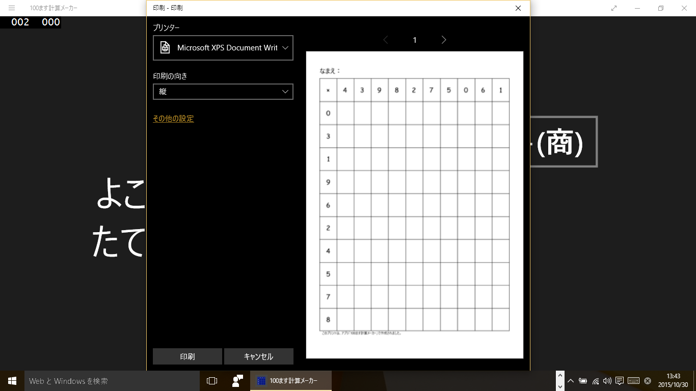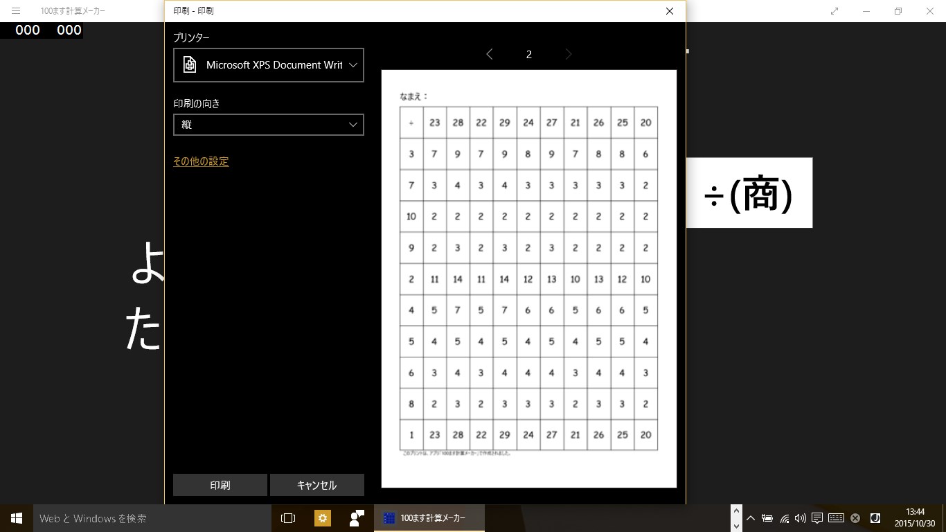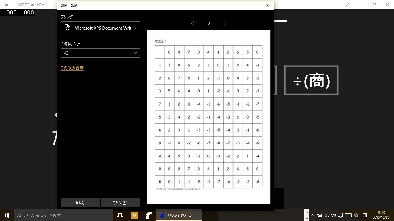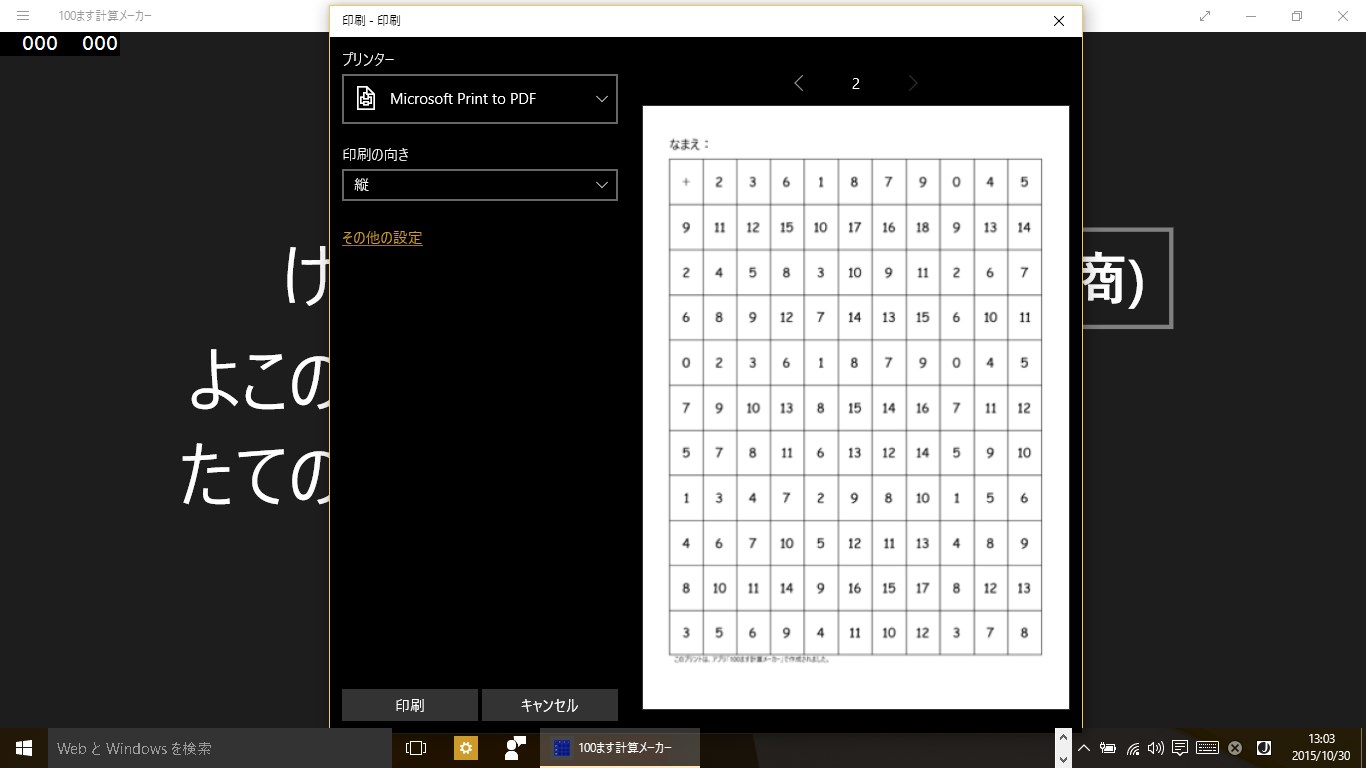 このアプリは、100マス計算のプリントを作成するアプリです。